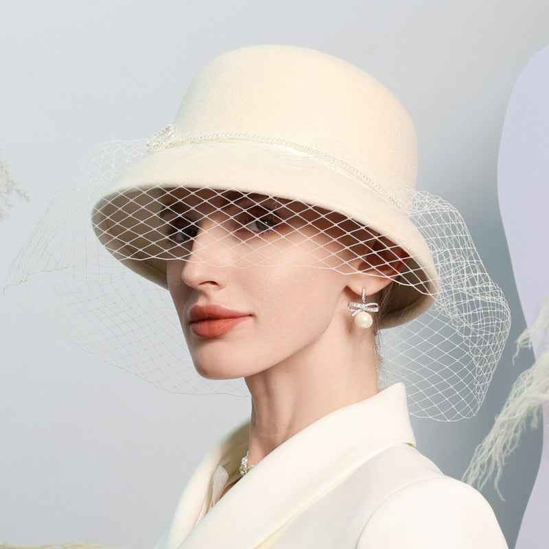 Women’s Vintage Winter Imitation Pearls Wool With Pearl Veil Special Occasion Cloche Hats – 416656