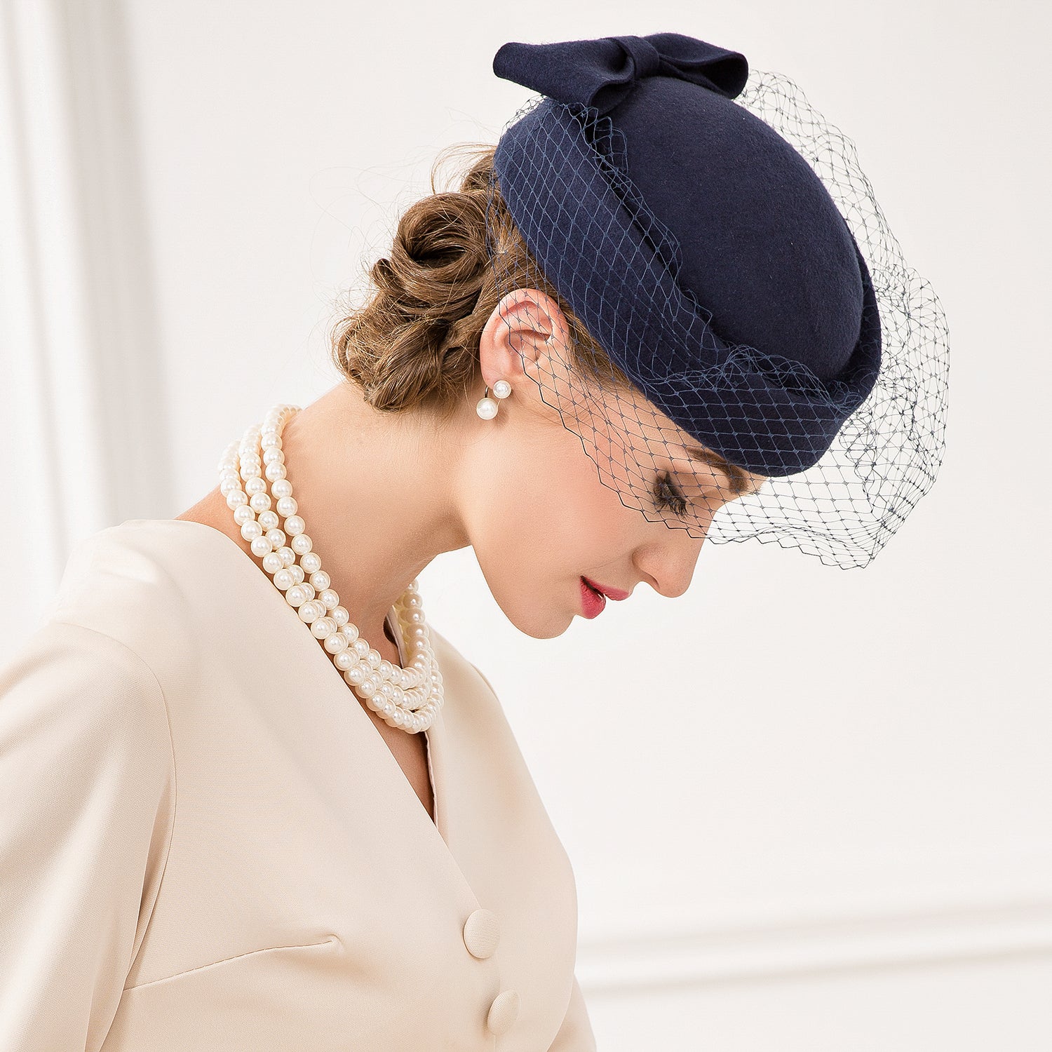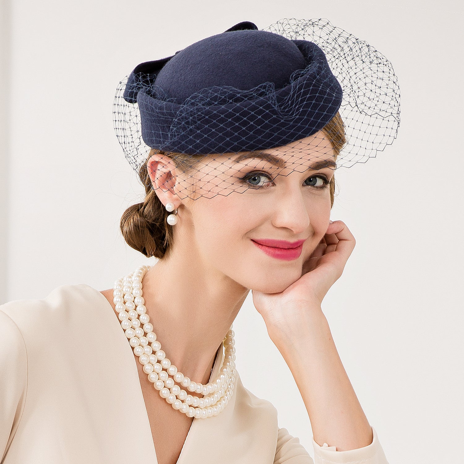 | Hat Style | Structured Pillbox Hat with Fascinator-Style Netting Veil |