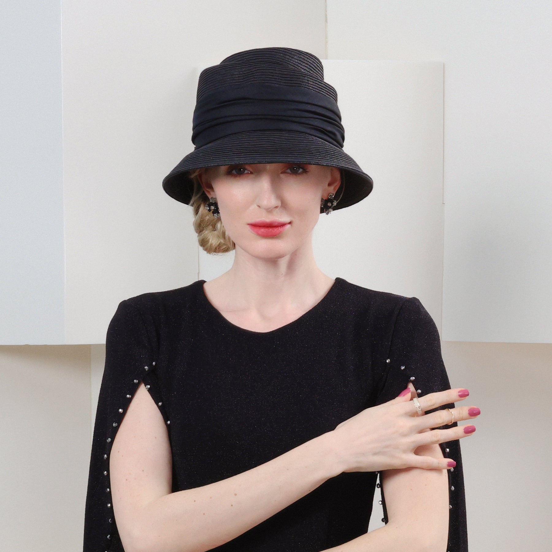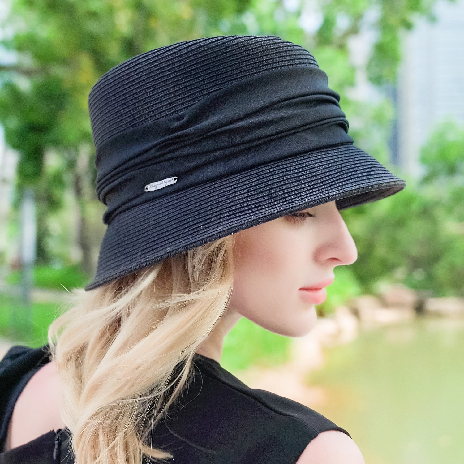 Introducing a stylish fashion bucket hat that combines elegance with sun protection. The hat features a wide, flat brim crafted from a woven straw alternative, and a structured mid – profile crown with a sleek black color. A gathered fabric band around the crown adds a touch of sophistication to this minimalist design.