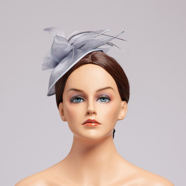 Introducing a stunning fascinator crafted for formal elegance. It features a solid pale gray/light blue – gray base made of lightweight, sheer netting, complemented by white feather plumes and a fabric rosette. The fine details and high – quality construction make it a perfect accessory for high – society events.