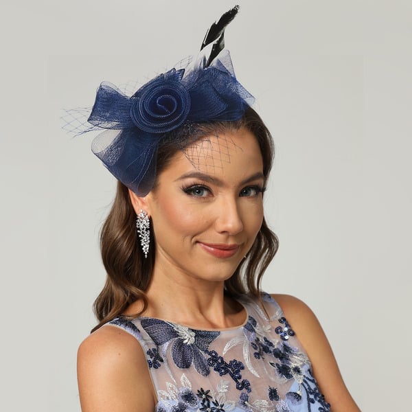 Enhance your formal look with this stunning fascinator. It features a deep blue tulle rosette, paired with black fine tulle netting and a vertical black feather accent. The high – quality materials and meticulous construction make it a perfect accessory for any formal event.