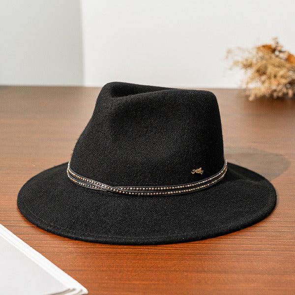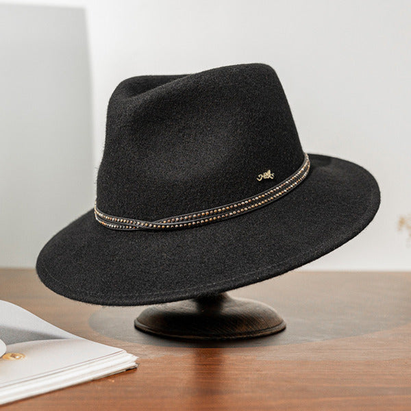 This elegant fedora combines classic charm with modern flair. Crafted from a smooth wool felt blend, it features a solid black base that offers durability and warmth. A decorative metallic band with small, shiny accents adds a fashion – forward touch, making it a standout accessory.