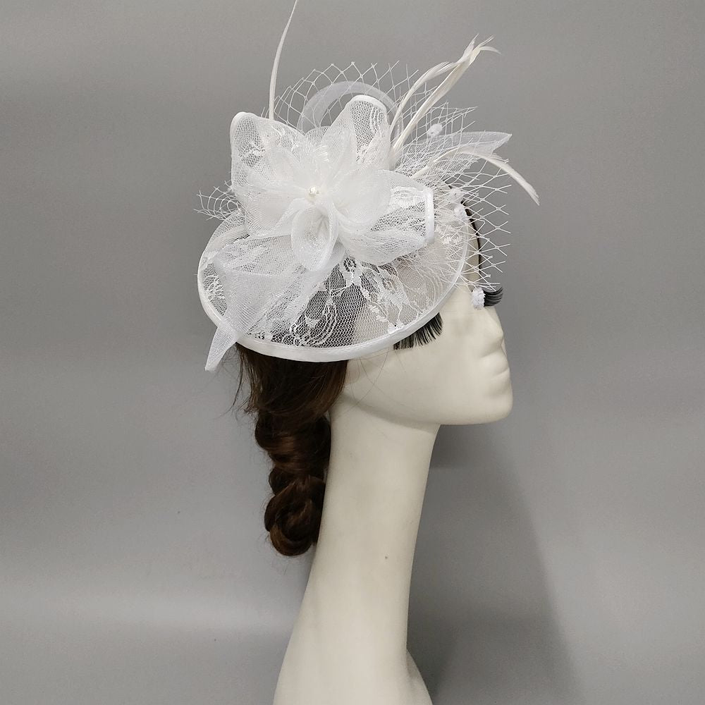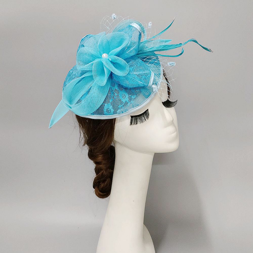 - Material: Synthetic fabrics (polyester/nylon), lace (synthetic or cotton – blend), millinery feathers, and a pearl accent