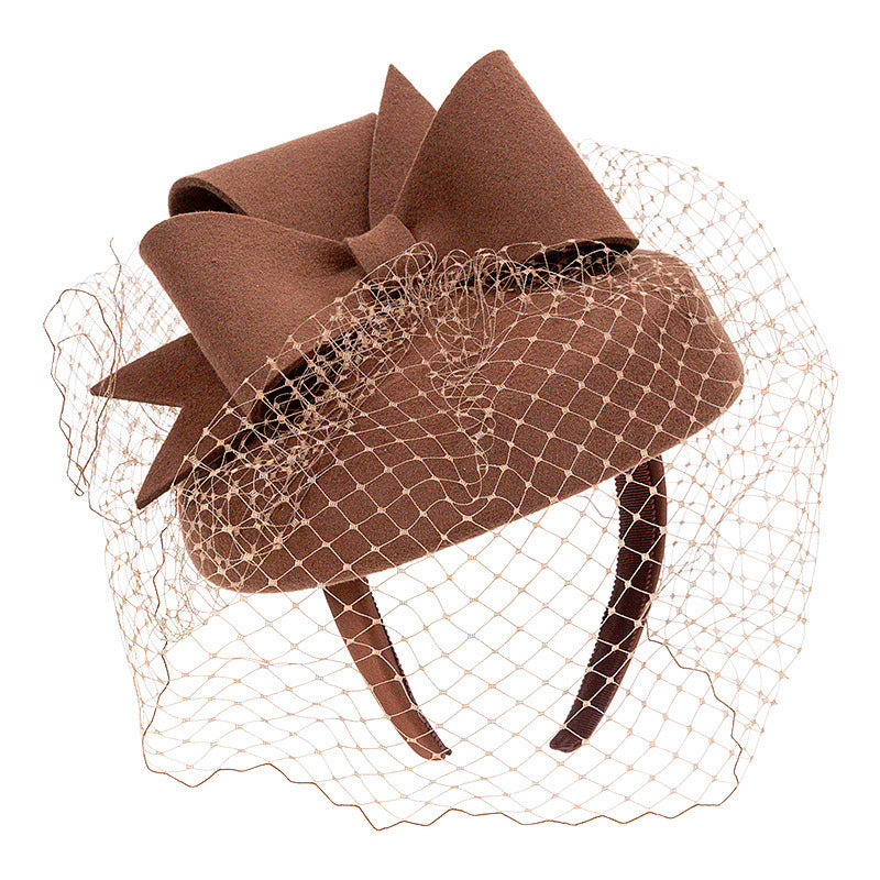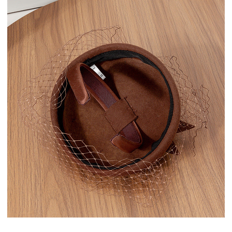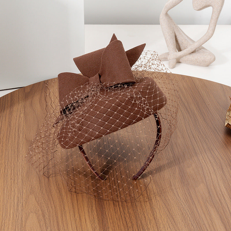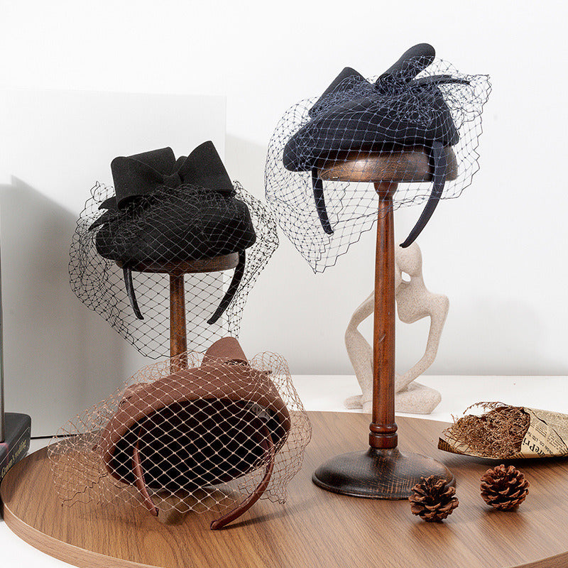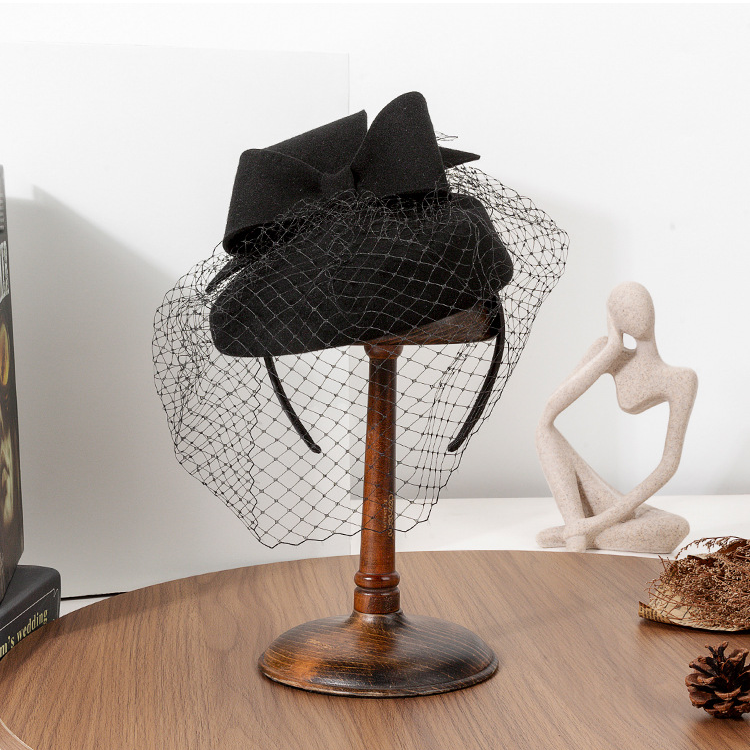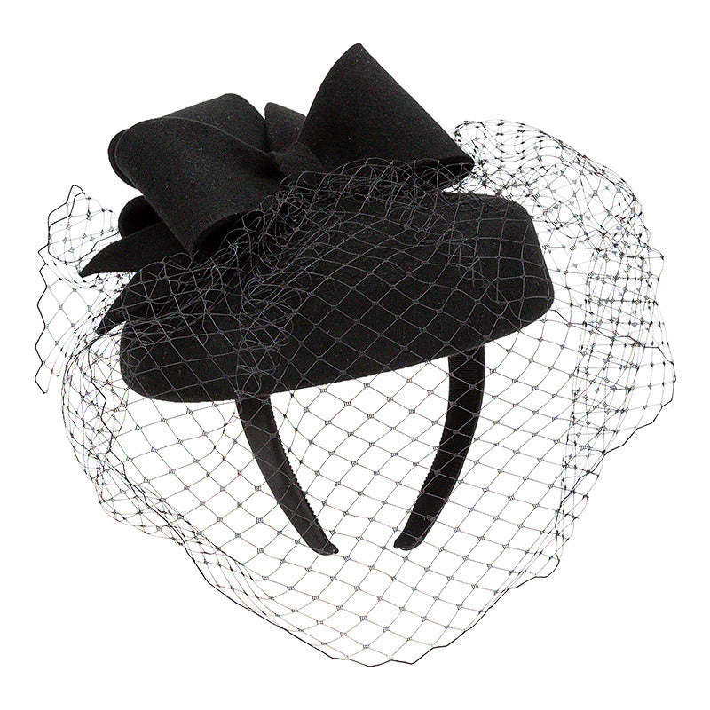 - Material: Wool or synthetic felt (main hat & bow), Nylon mesh netting (veil), Elasticized synthetic fabric (headband)