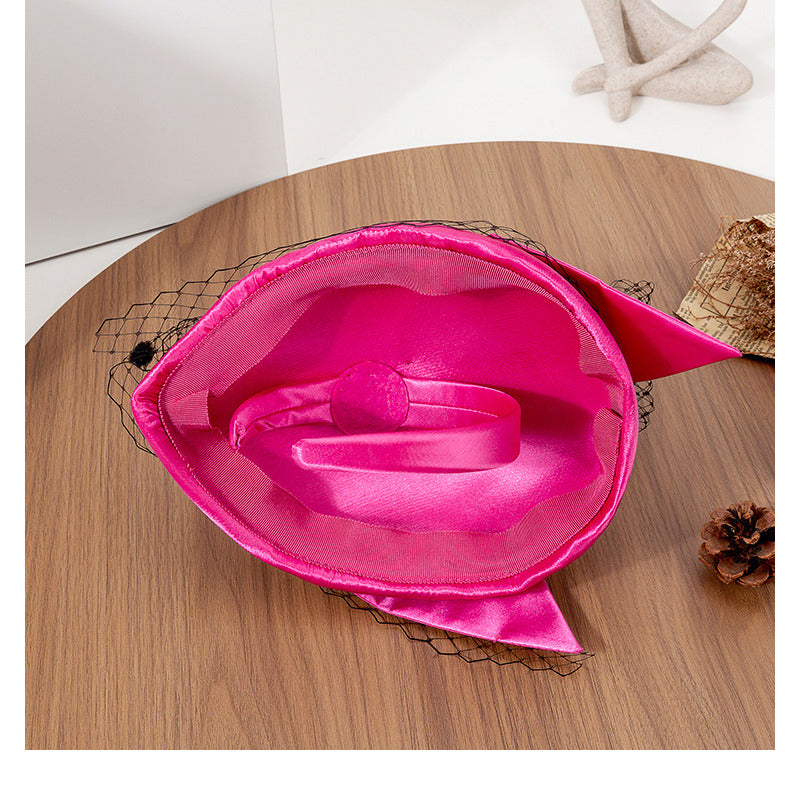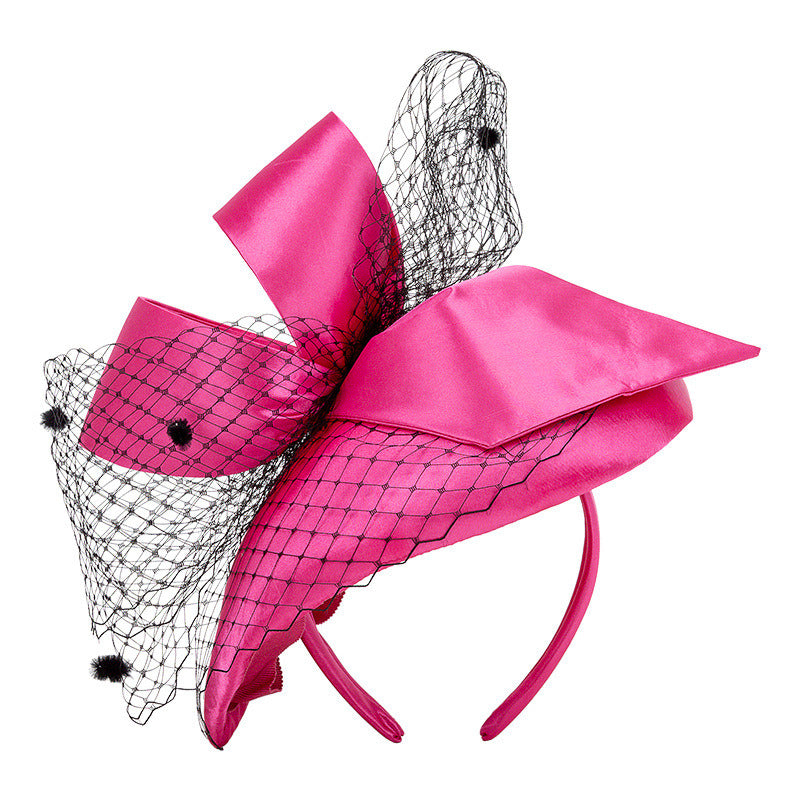 This elegant fascinator is a stunning accessory for formal events. It features a vibrant pink satin base, forming a structured, flower – shaped silhouette. A black birdcage netting with small pom – poms adds a touch of whimsy, while a large pink satin bow serves as the focal point.