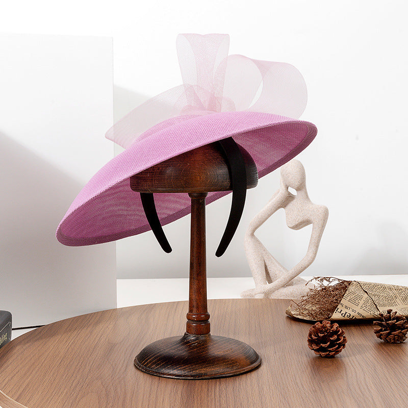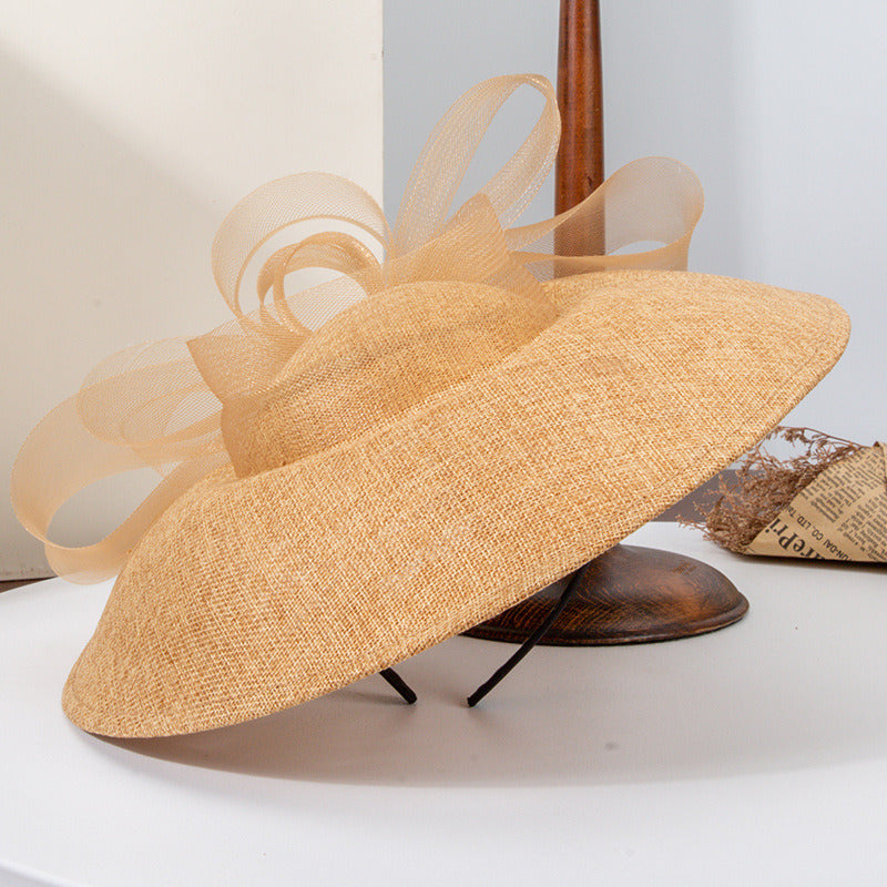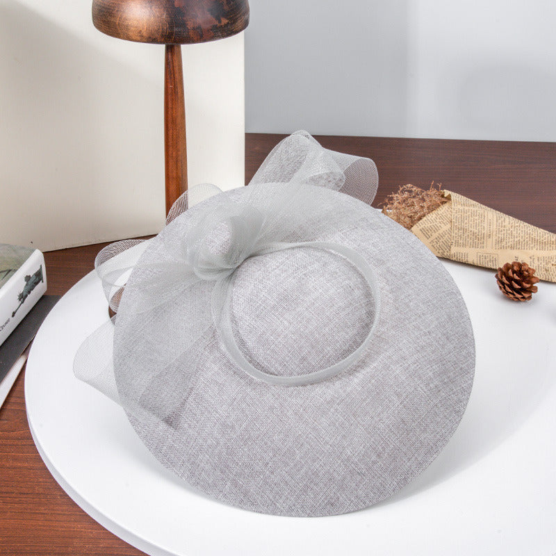 This wide-brimmed fascinator is a masterpiece of formal fashion. The main brim, crafted from a woven straw-like fiber in a medium brown color, offers a structured and vintage-inspired look. The dark gray/black decorative mesh ribbons add an elegant and whimsical touch, making it perfect for high-society events.