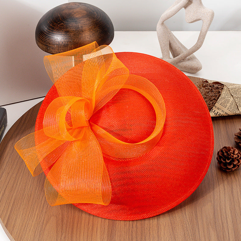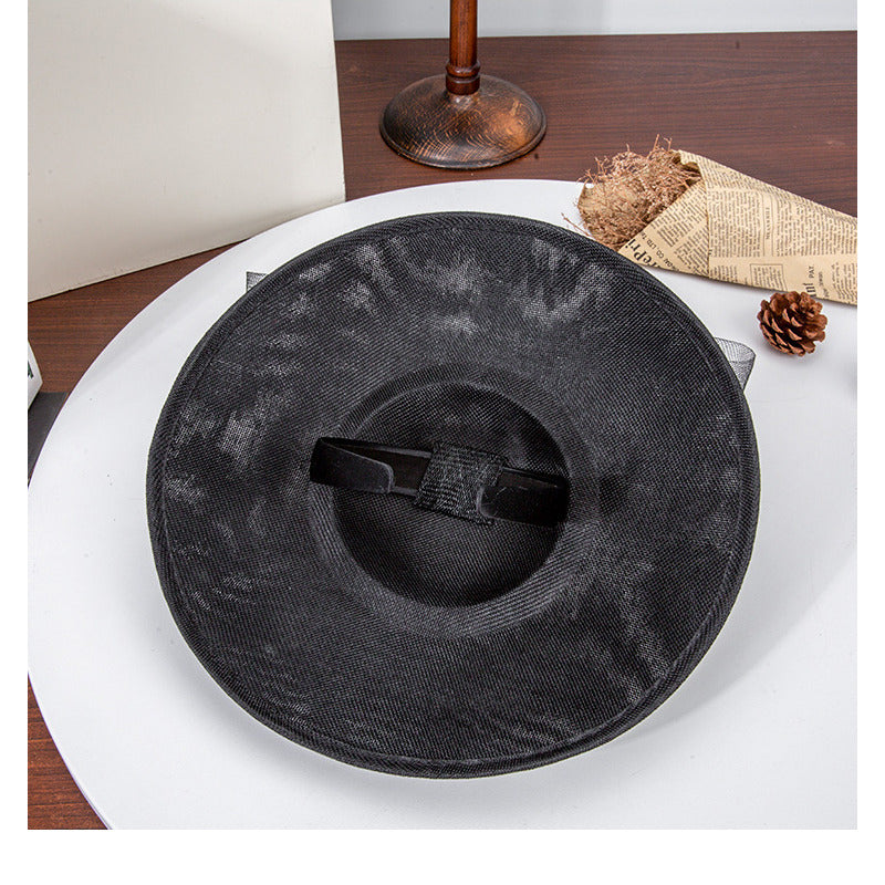 - Material: Woven straw-like fiber (main brim), fine black mesh netting (decorative elements)
