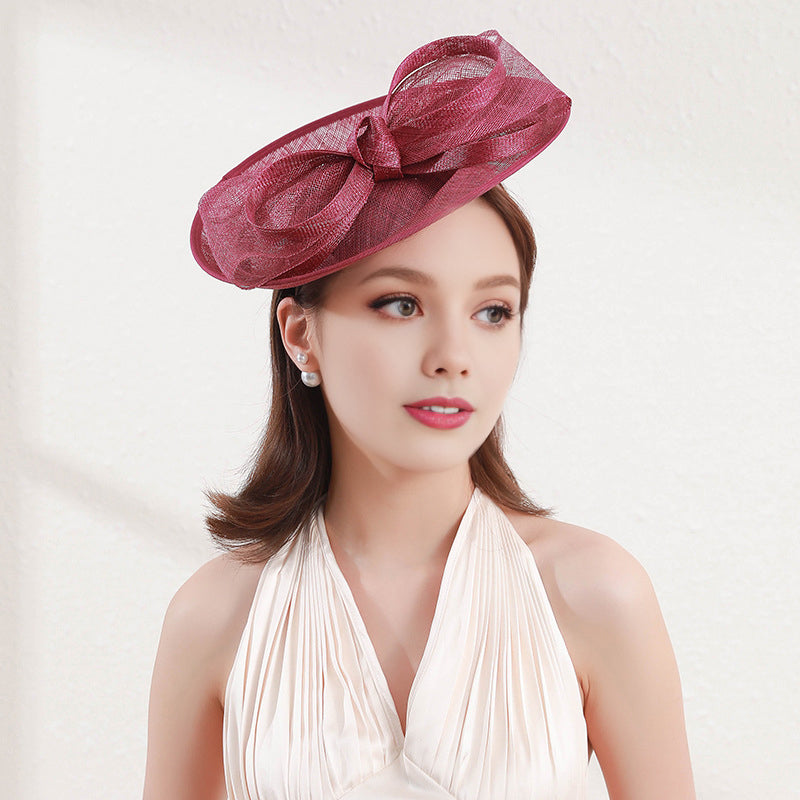 Enhance your formal ensemble with this exquisite fascinator. Crafted from a rich burgundy/magenta – red woven mesh/sinamay material, it features a large, symmetrical bow as its centerpiece. The structured oval base gives it a classic and elegant look, perfect for high – end events.