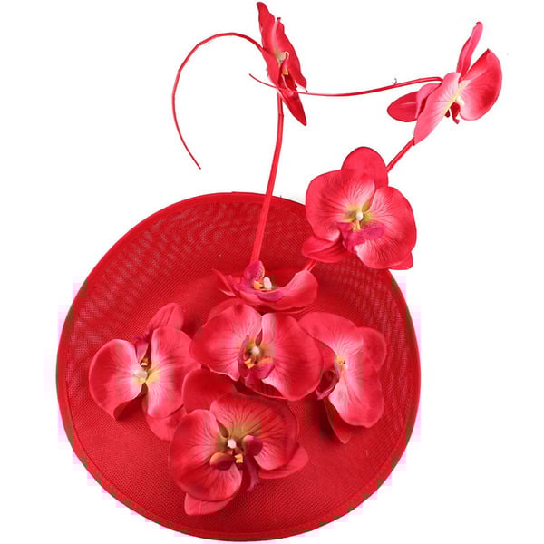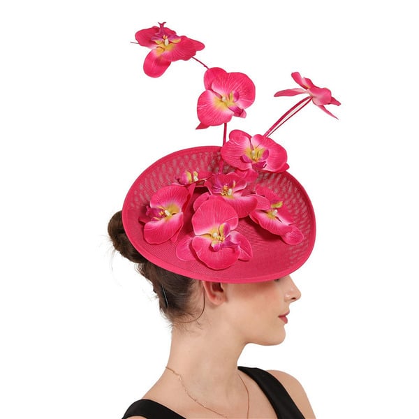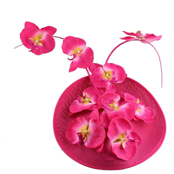 Introducing an elegant fascinator/headpiece, a perfect accessory for formal events. It features a deep magenta/purple nylon/polyester mesh base with bright pink/magenta silk or high – grade polyester artificial orchid accents. The clustered, cascading arrangement of the orchids adds a touch of sophistication.
