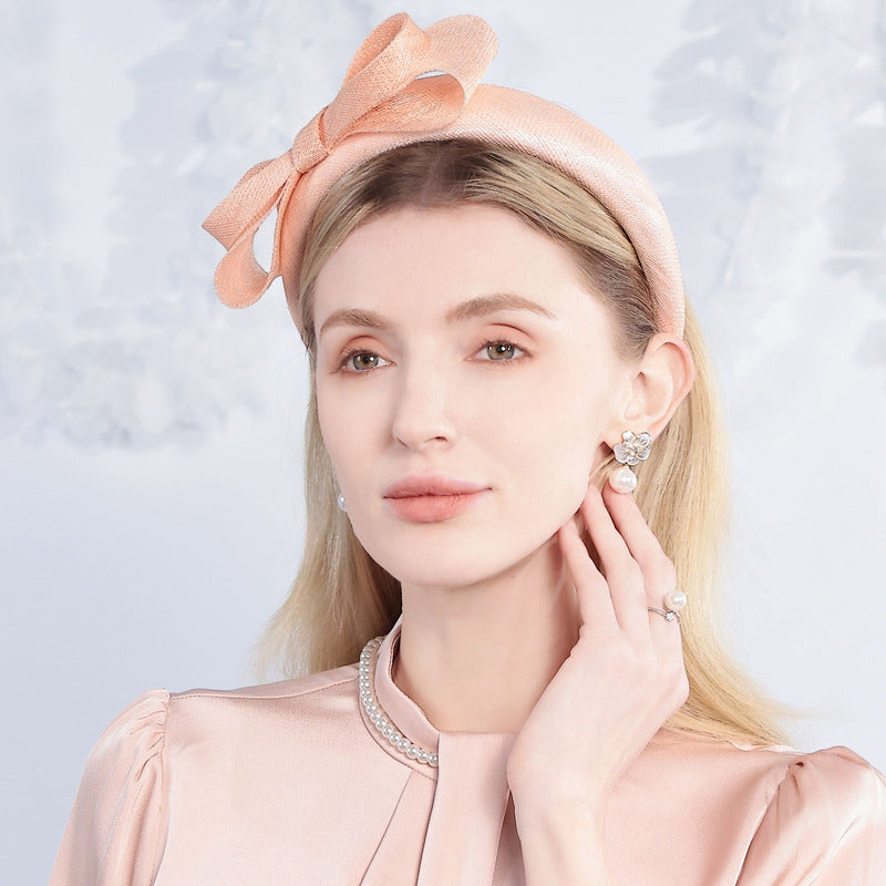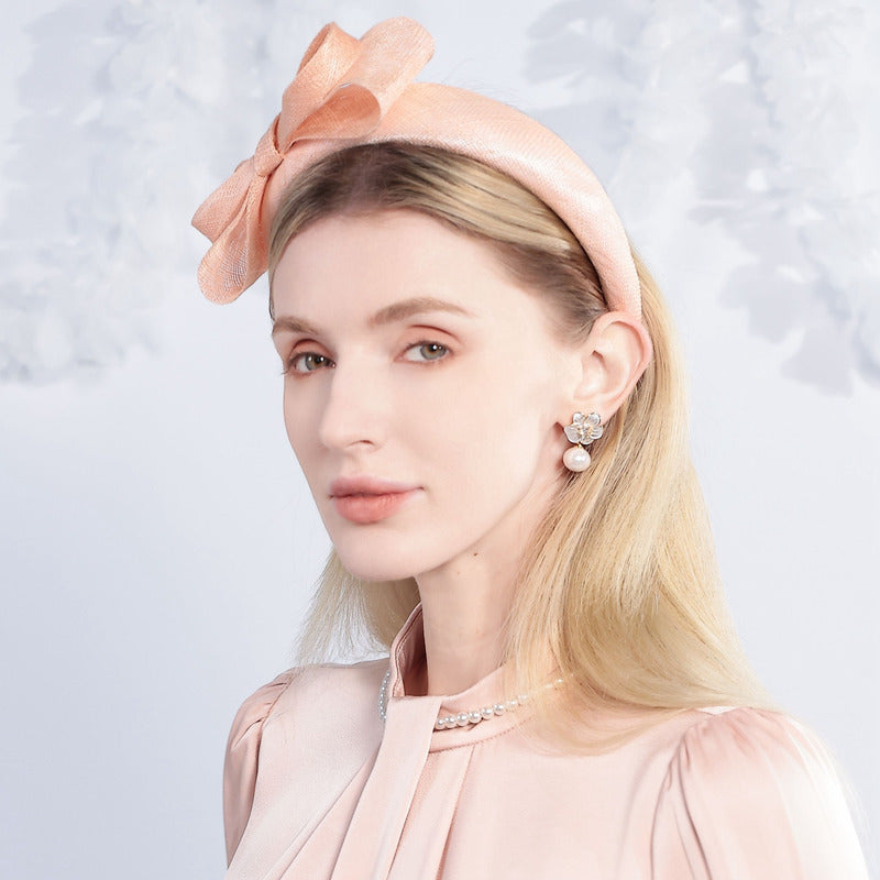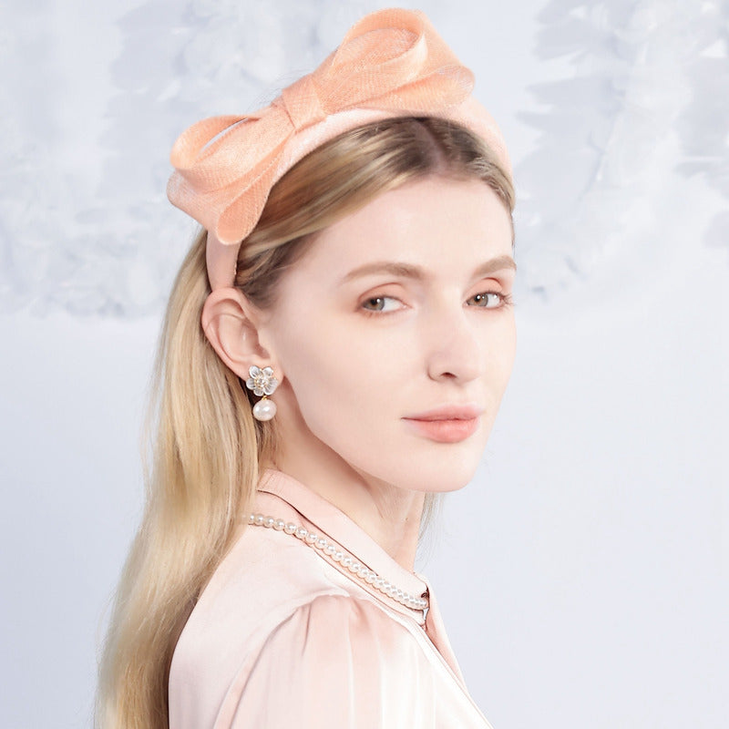 This elegant fascinator-style headpiece is a perfect accessory for formal events. Crafted from a woven synthetic fiber, it features a smooth, subtle woven texture with a slight sheen. The light peach/coral pink color and large, structured bow add a touch of sophistication and femininity.