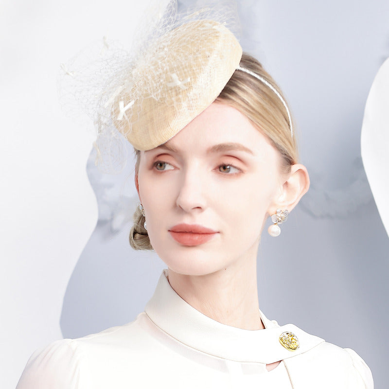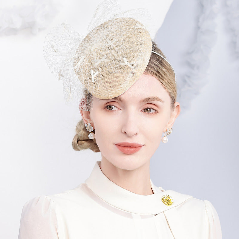 Enhance your formal look with this elegant fascinator. Crafted from woven straw-like material in a light ivory/beige color, it features a structured crown and a delicate white tulle veil. The white elastic headband ensures a comfortable and secure fit.