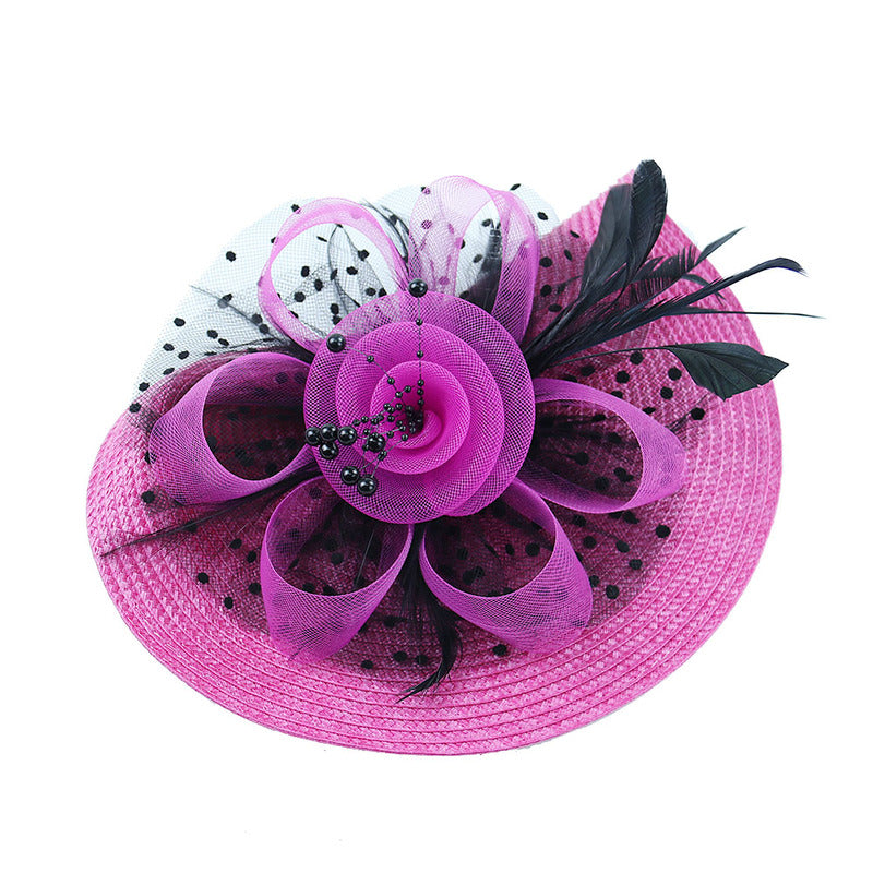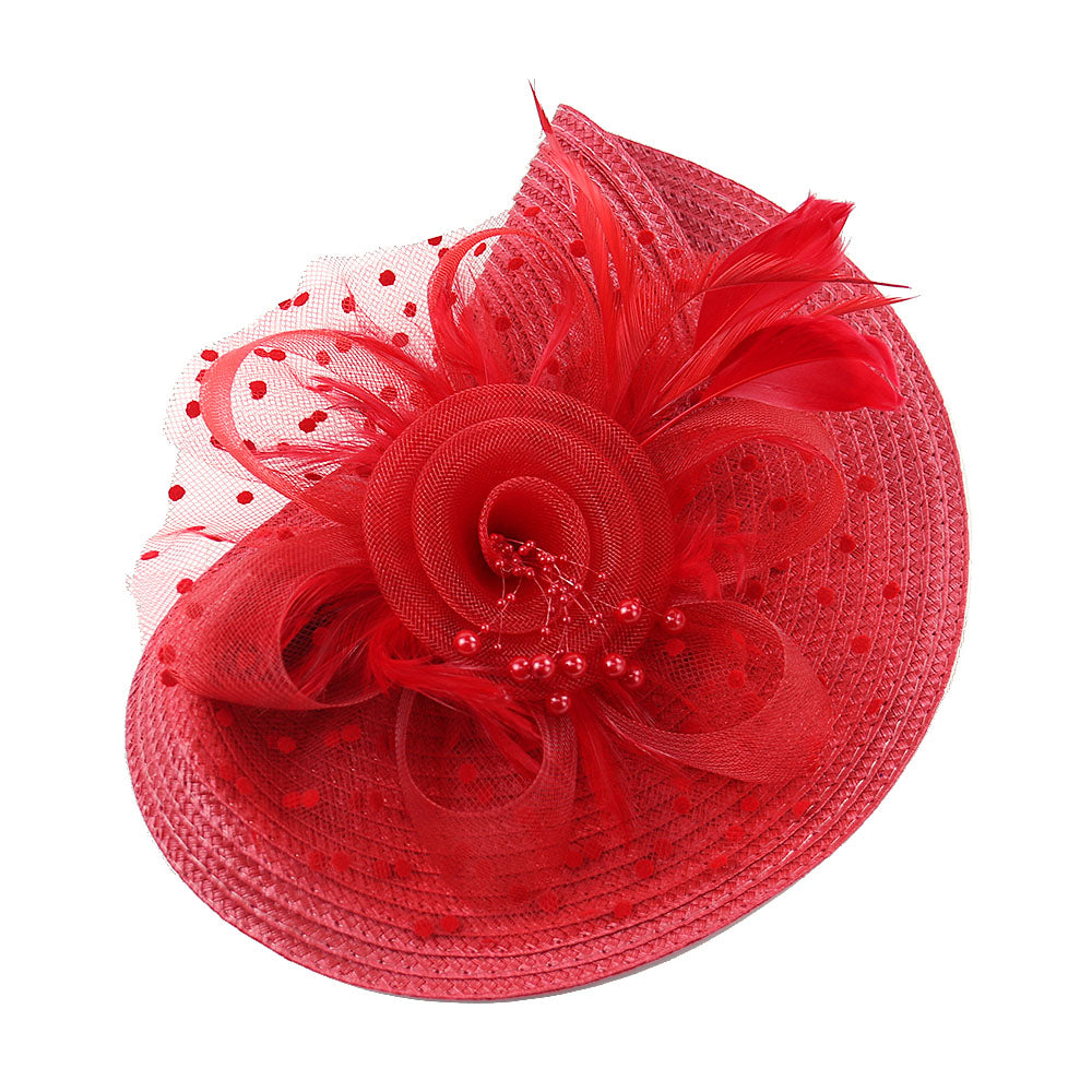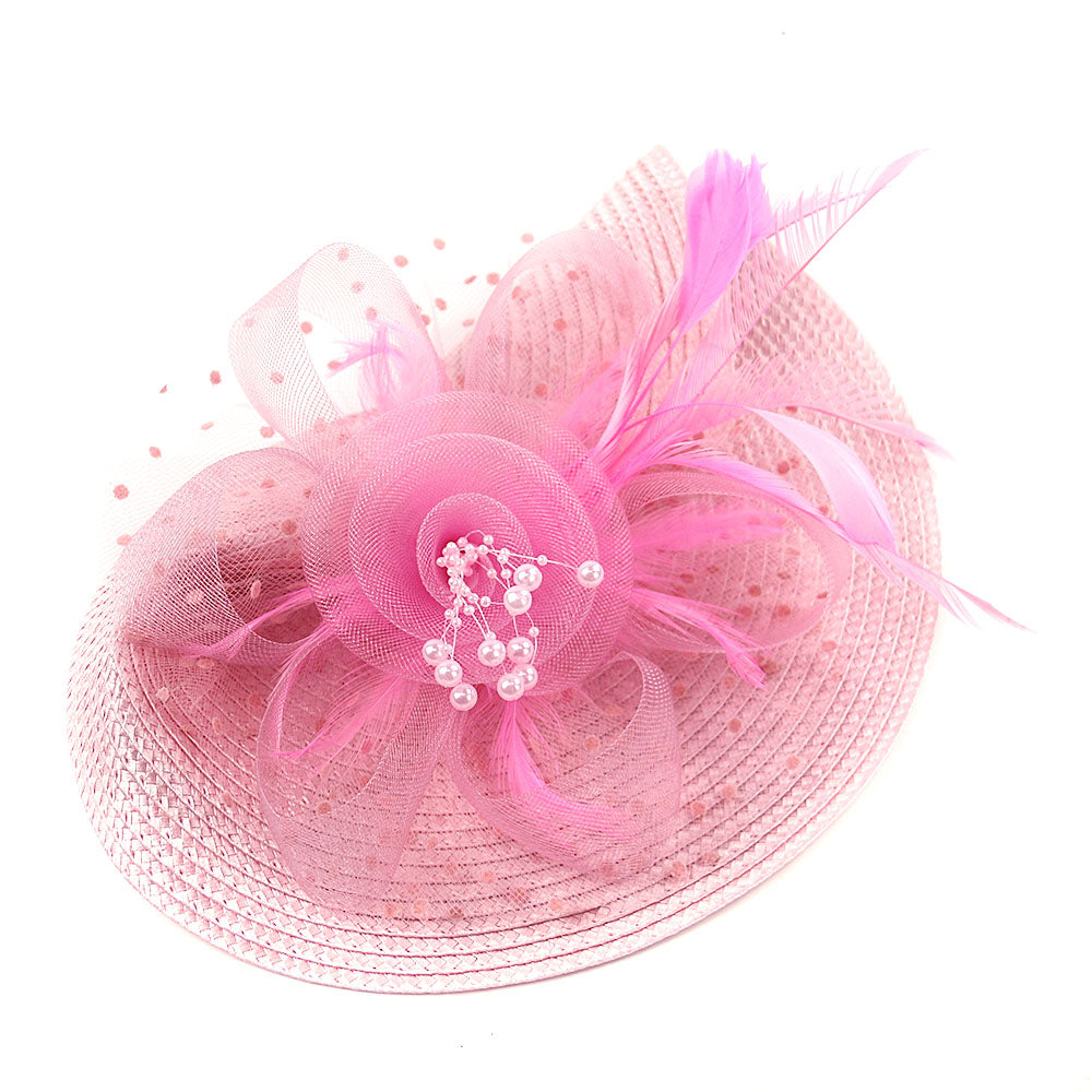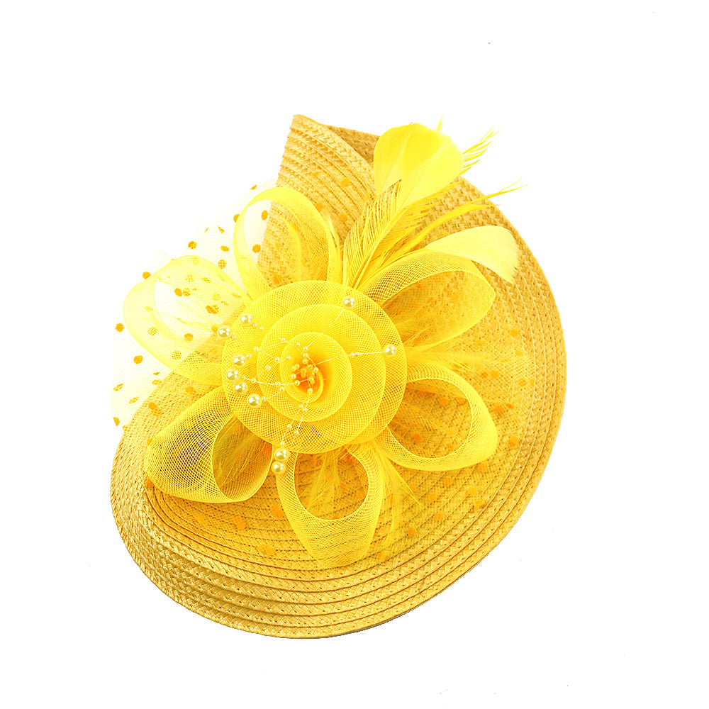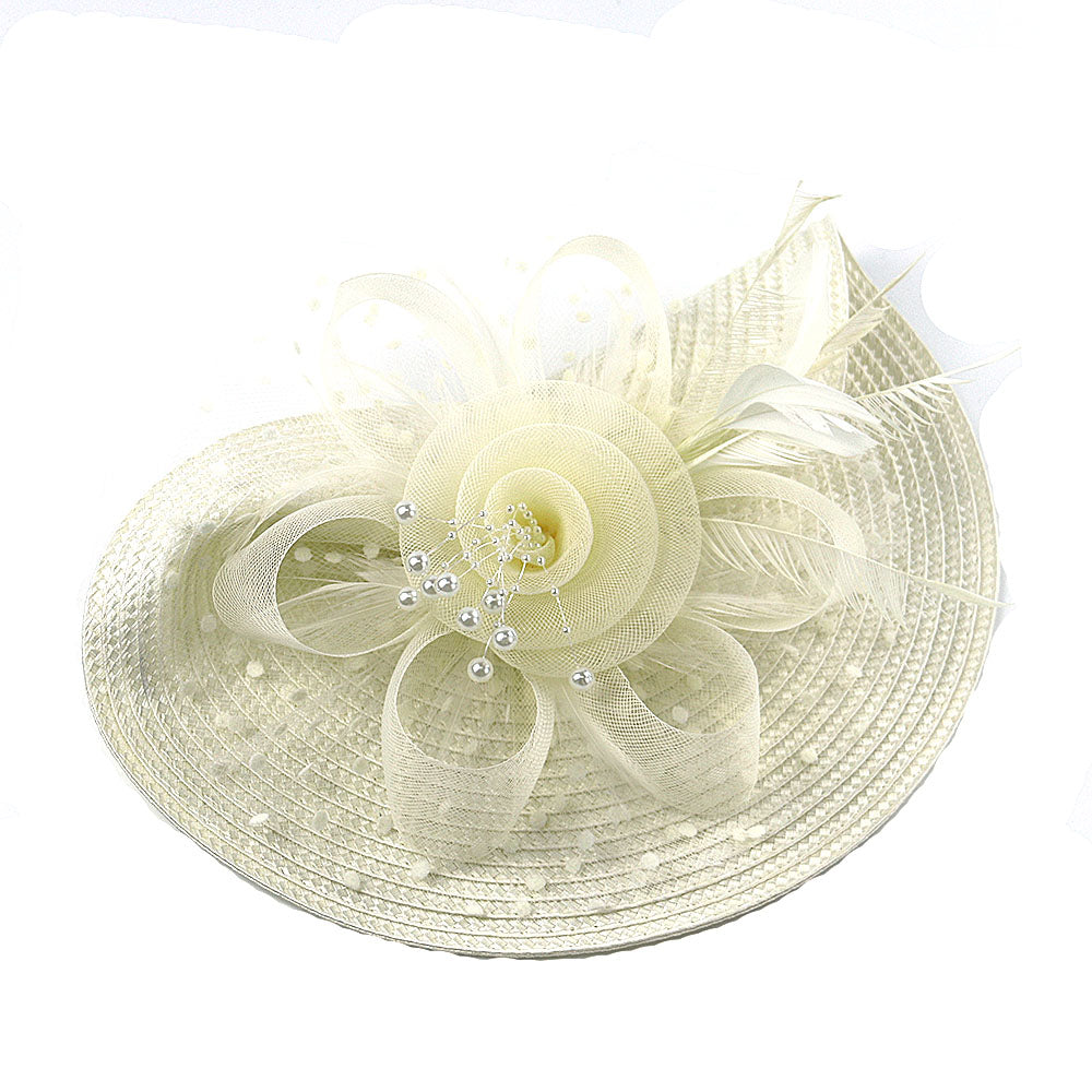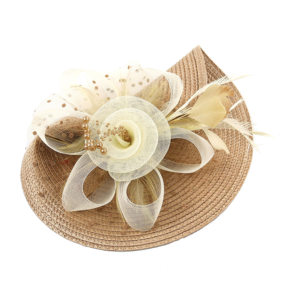 - Material: Woven straw-like synthetic, tulle/netting, feathers, beads