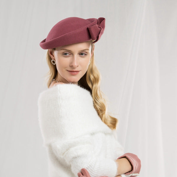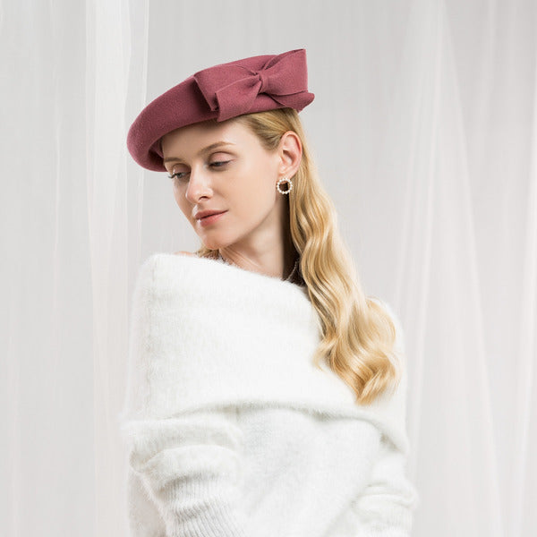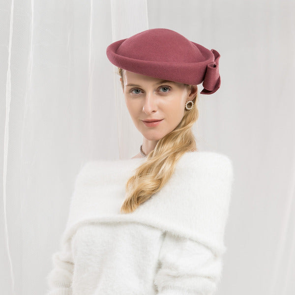 Introducing a structured beret crafted from premium wool felt. This elegant hat features a rich, muted burgundy/berry – red color and a matching fabric bow on the side of the crown. Its structured mid – high profile gives it a formal and tailored look, perfect for special occasions.