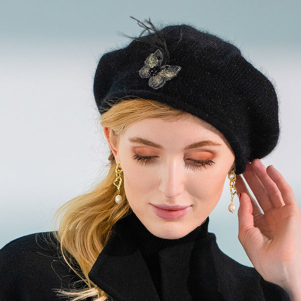 Introducing a timeless and elegant beret crafted from a wool or wool – acrylic blend. The solid black base is accented with a metallic silver butterfly brooch and a small black feather, creating a vintage – inspired look. Its soft, unstructured crown offers a comfortable and stylish fit.