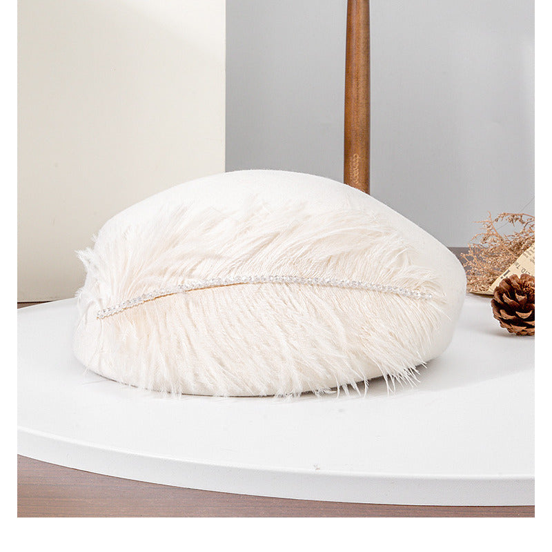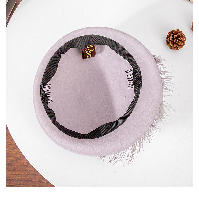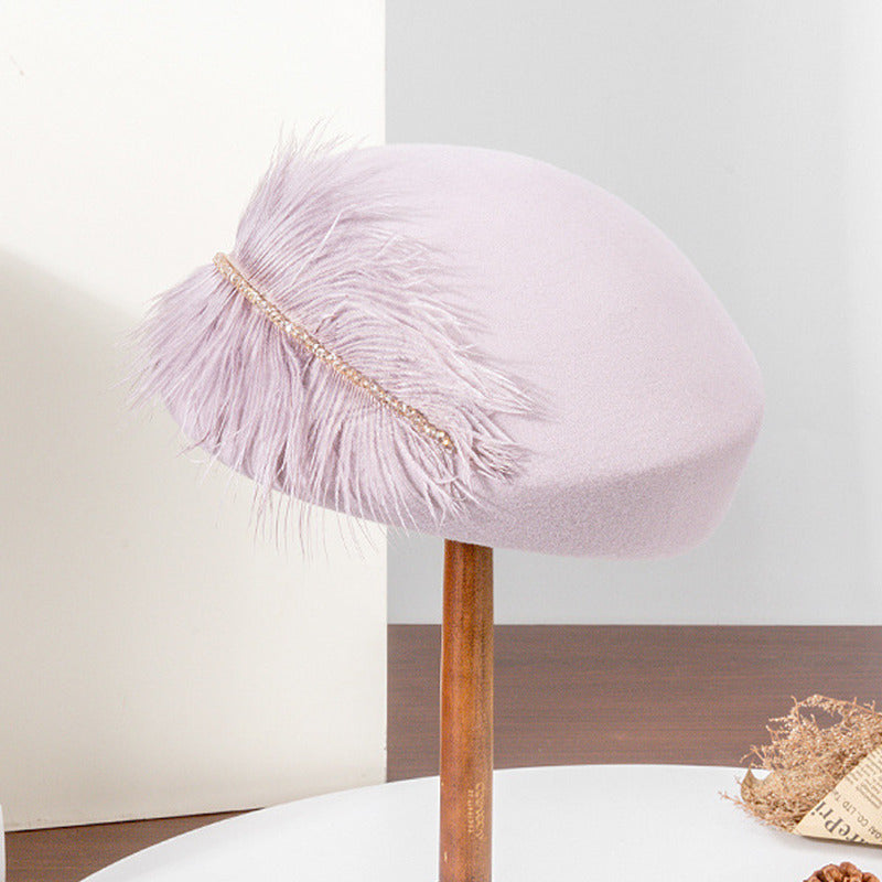 This beret is a masterpiece of elegance, crafted from a smooth, felt-like or wool – blend fabric. It features a muted lavender/taupe main body, complemented by a cream/white feather trim and a gold/beige beaded accent band, creating a visually stunning accessory.
