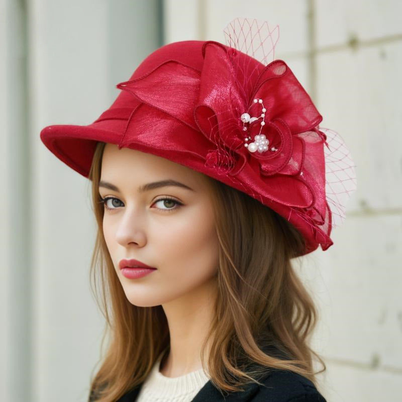 Step into style with this vibrant red structured formal dress hat. Crafted from high – quality wool felt, it features a short, flat brim and is adorned with a large red ruffled bow made of organza or tulle, along with white nylon/pearl bead accents. The solid red color with white decorative touches exudes a classic and fashionable elegance.