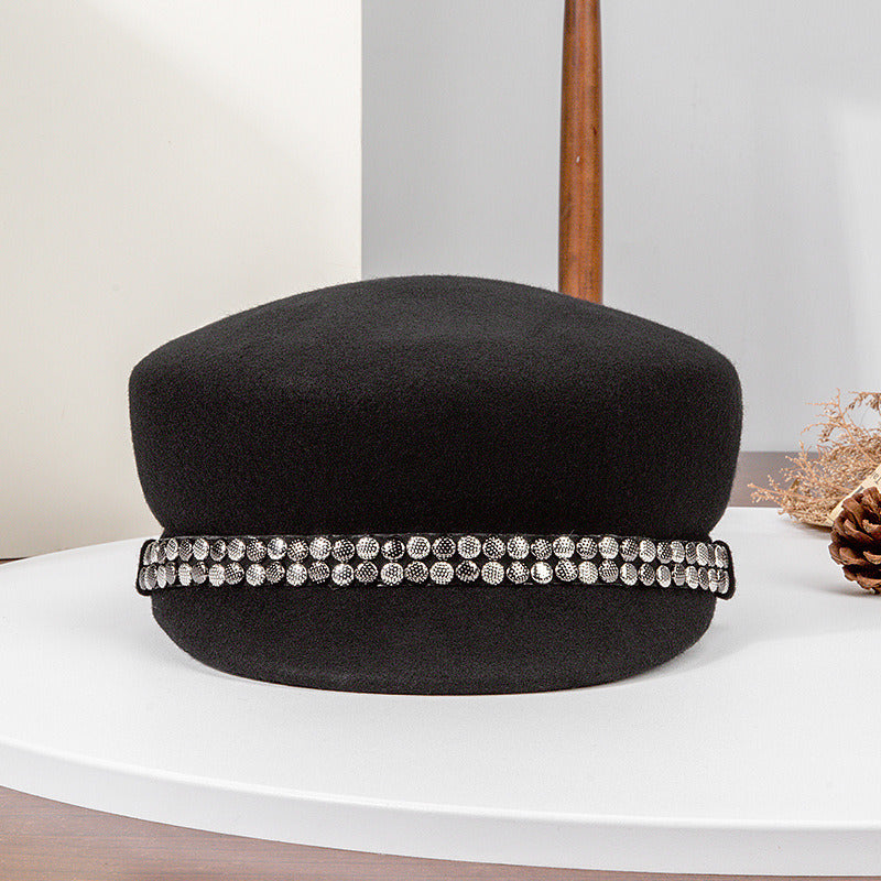 This newsboy cap, also known as a kepi or service cap, is a stylish and versatile accessory. Crafted from wool felt, it features a solid white base with a decorative band of circular metallic discs in silver/gray around the crown – brim junction. The structured silhouette and metallic embellishment give it a classic yet modern look.