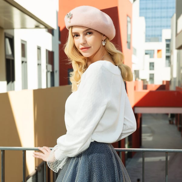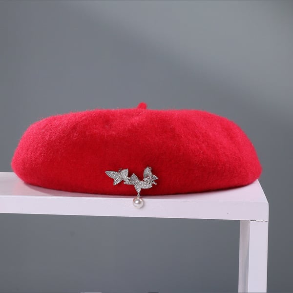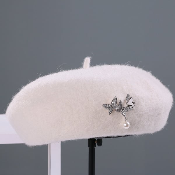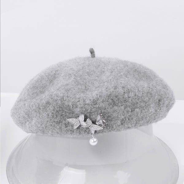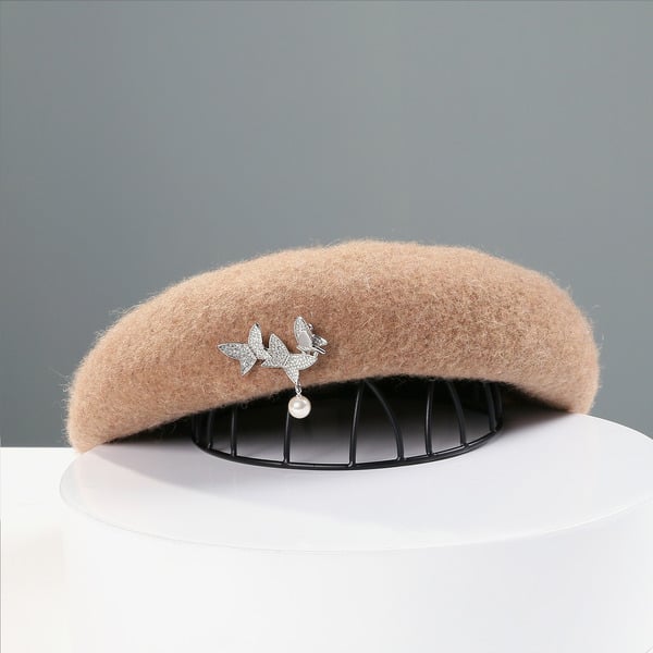 Indulge in timeless elegance with this soft pink wool beret. Its unstructured, rounded crown and lack of a brim exude a classic charm, while the silver and white dual – butterfly brooch with pearl detailing adds a touch of modern fashion.