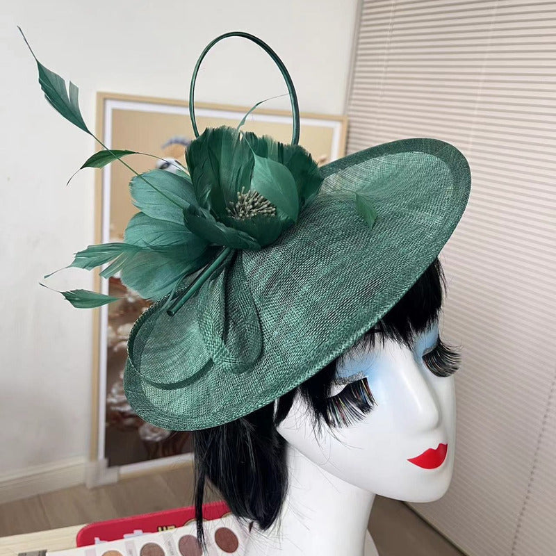 | Material | Fine, open – weave netting (likely sinamay), green feathers, possibly curled wire/ribbon |