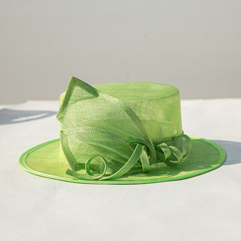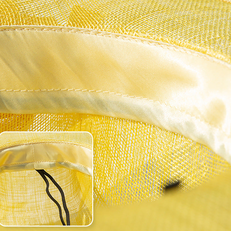 These elegant fascinators are crafted from a lightweight, woven sinamay or straw – fiber felt, offering both structure and breathability. They come in solid colors such as beige, green, white, and yellow, with matching sheer tulle or organza ribbons forming decorative bows and loops.