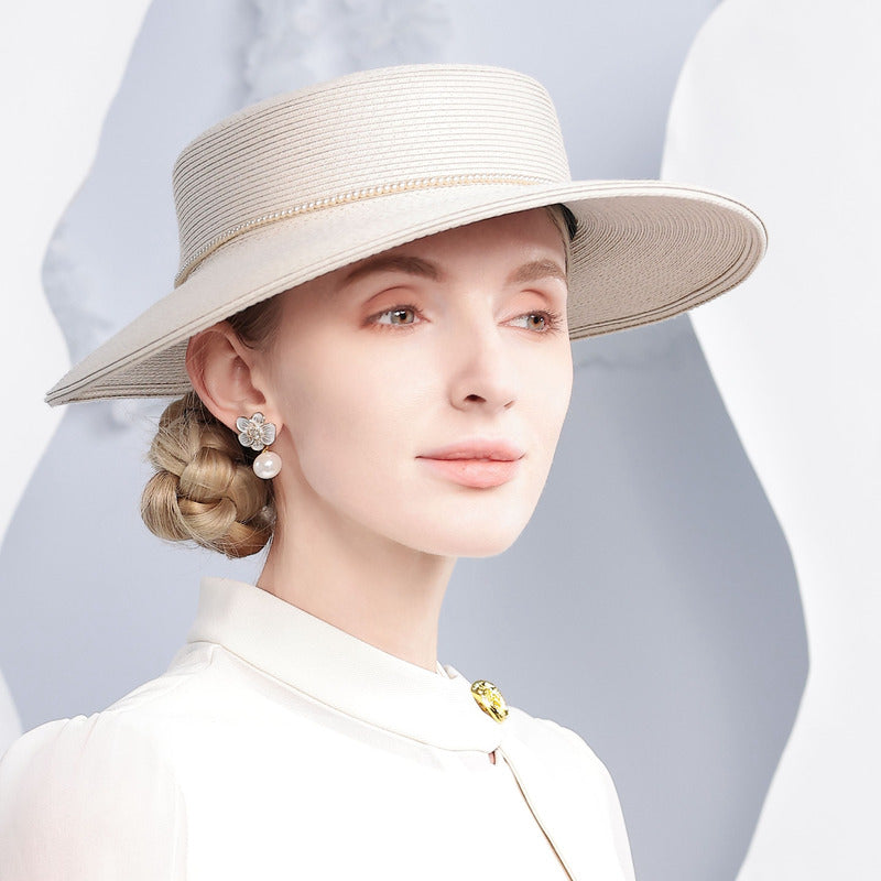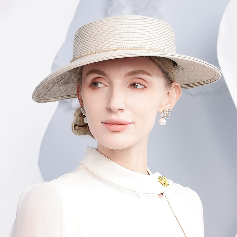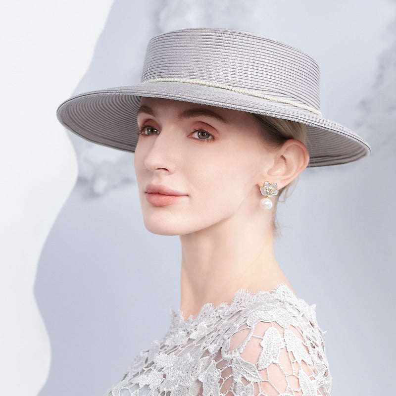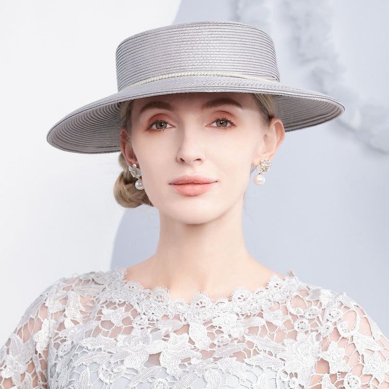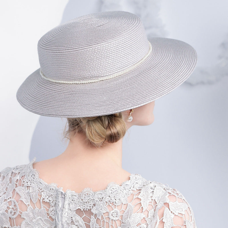 Introducing a formal sun hat that exudes classic elegance. Crafted from high – quality straw with a woven texture, it features a light gray/silver solid body and a white/ivory pearl/beaded band around the crown. The wide, flat brim provides excellent sun protection, making it perfect for formal summer events.