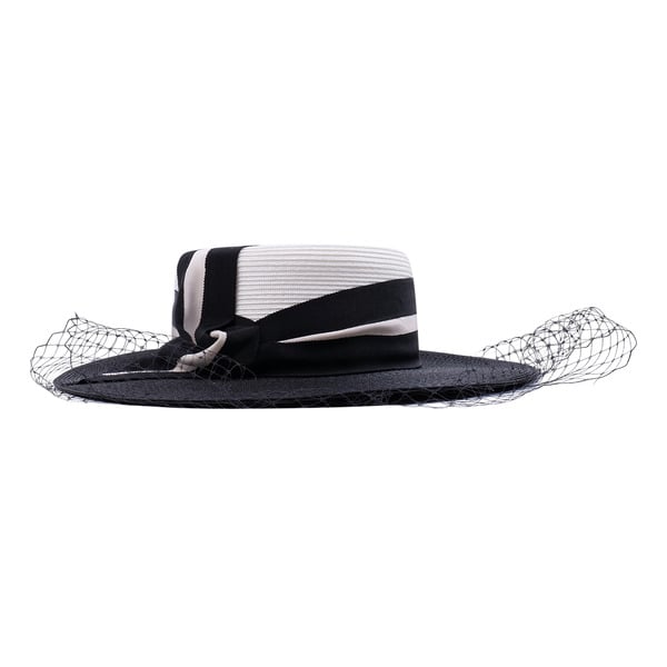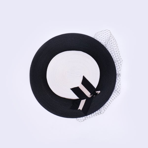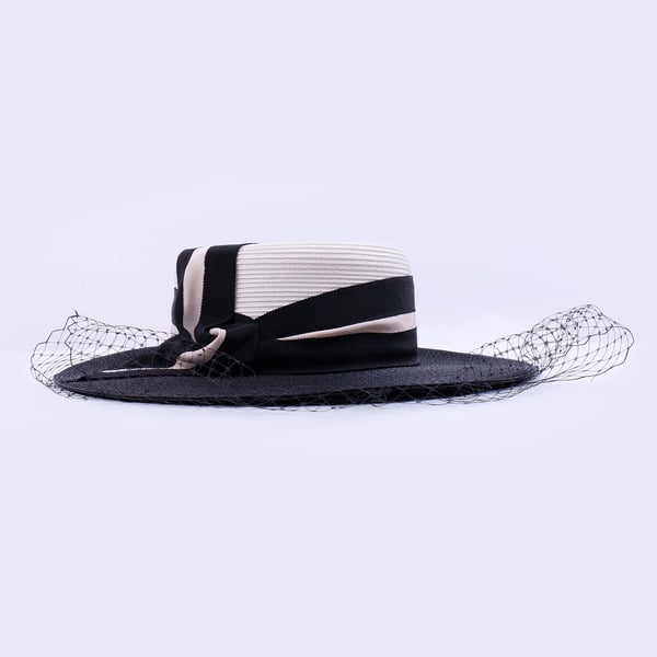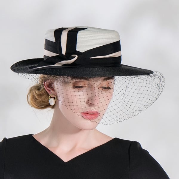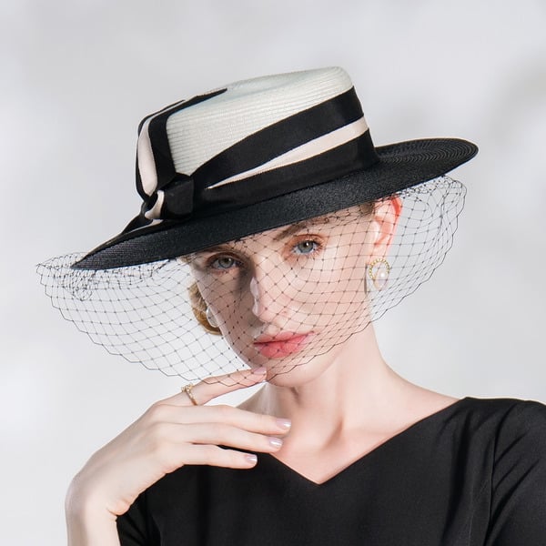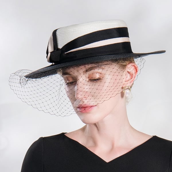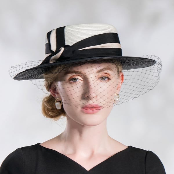 Step into any formal event with elegance wearing this Kentucky Derby-style hat. Boasting a white straw body, it’s paired with a black satin band featuring a cream trim and a black bow, and a black net veil. The structured high crown and wide flat brim add a touch of classic formal fashion.