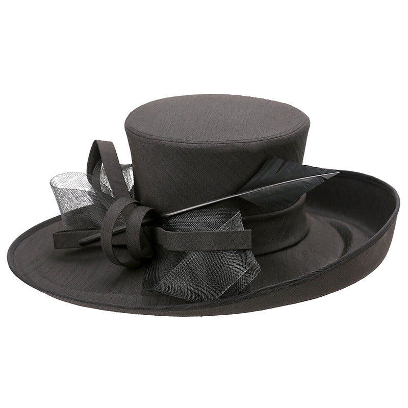 This is a classic structured formal hat with a wide brim, reminiscent of Kentucky Derby hats. It’s crafted from a woven, straw-like synthetic fabric with a smooth, slightly sheen-textured appearance. The hat features black mesh and a black synthetic feather as decorative elements, presenting a monochromatic black design.