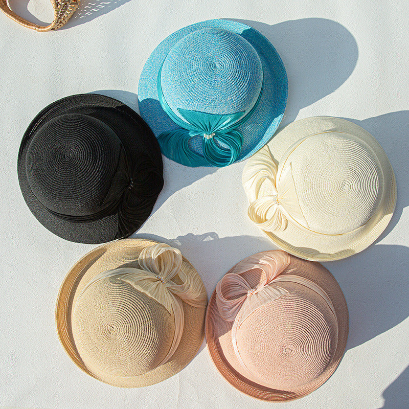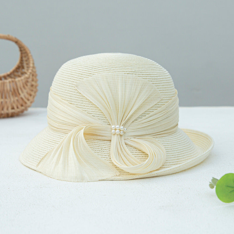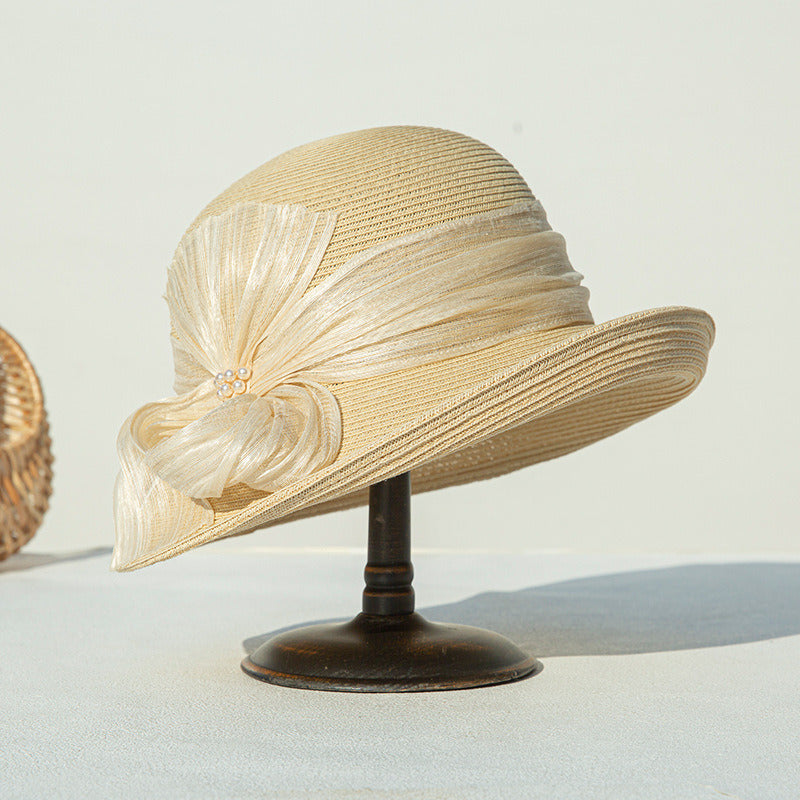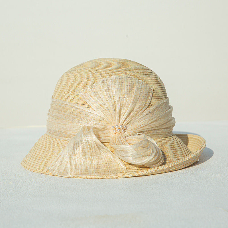 This is a wide-brimmed sun hat crafted from breathable straw. It features a soft peach/pink color with a solid pattern. The hat is adorned with a large, pleated sheer bow and a cluster of small pearl-like beads at the center, adding an elegant and vintage touch.