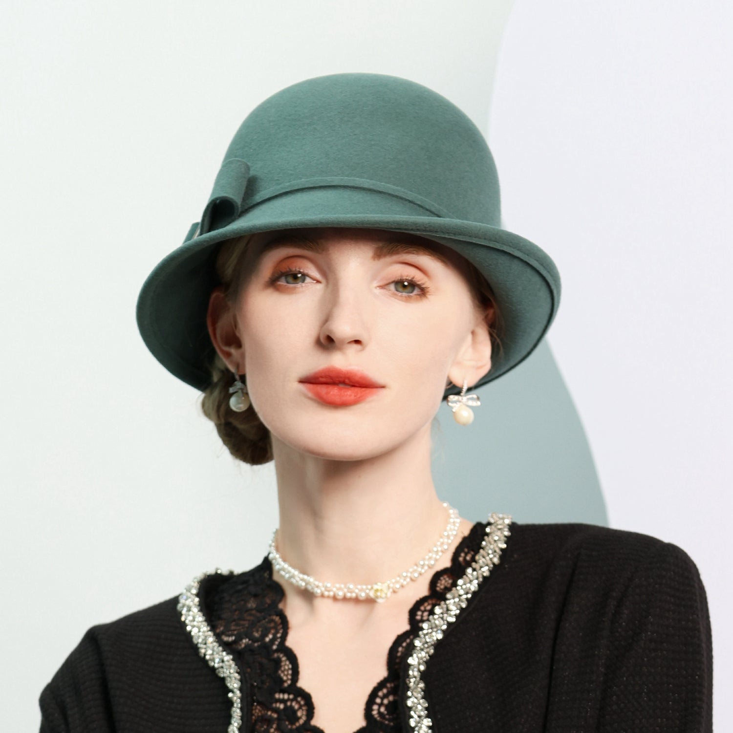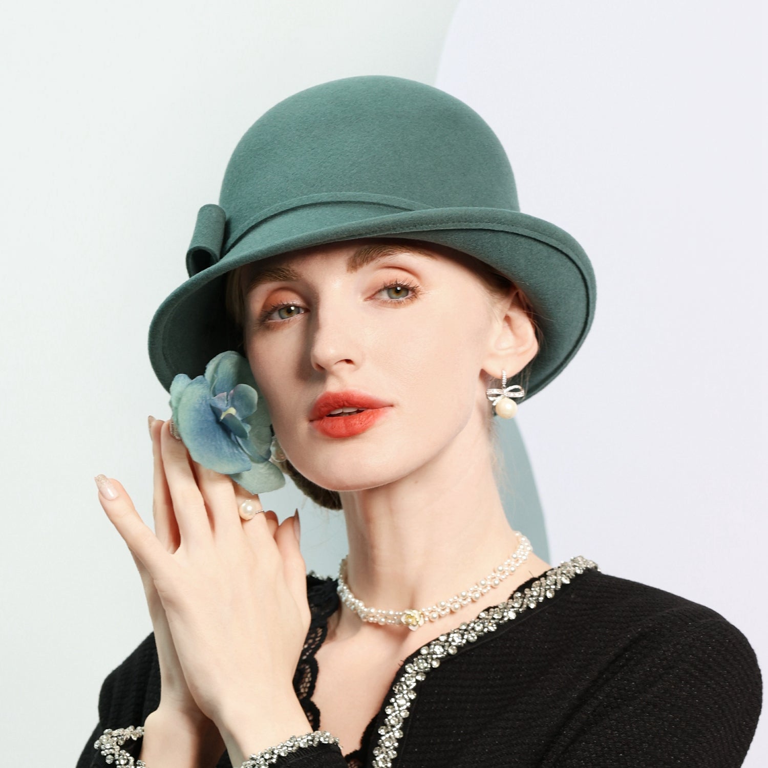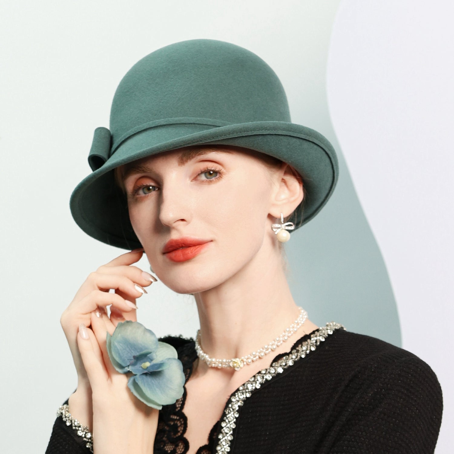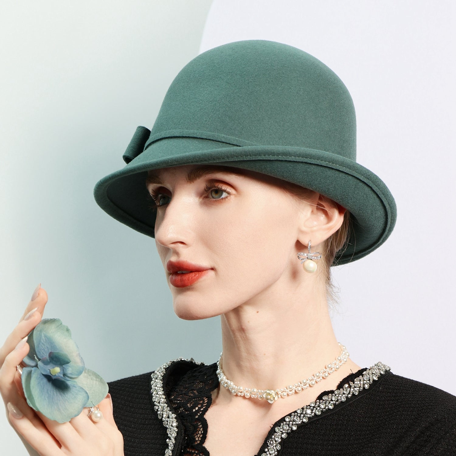Step into timeless elegance with this women’s wool felt hat. It features a structured mid – profile crown and a short, slightly curved brim. The solid teal/green – blue color is accented by a small matching fabric bow, creating a classic and vintage look.