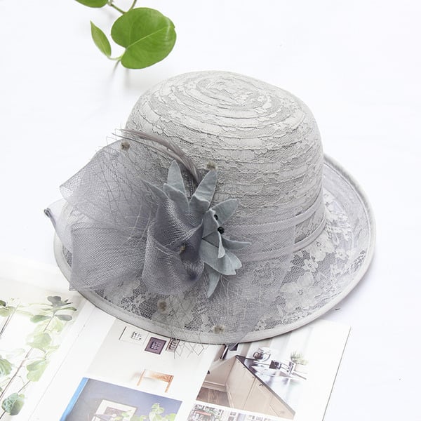 - Material: Woven straw or straw – blend for the main body, tulle or organza for the flower