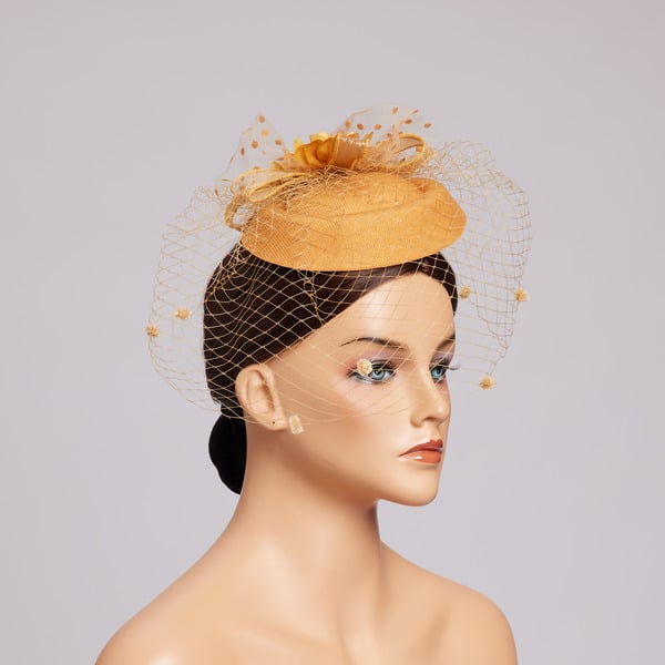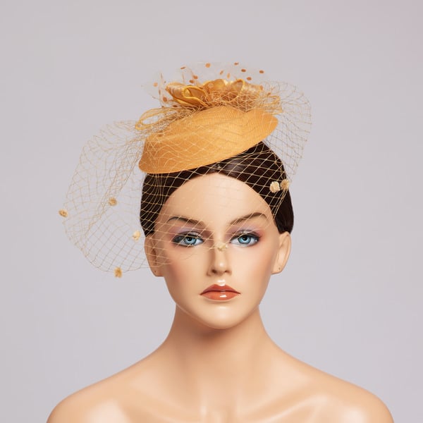 Introducing a stunning fascinator that combines elegance and style. This pillbox fascinator with a veil features a structured yellow base, a sheer yellow nylon mesh veil, and a beautiful satin/silk flower adorned with yellow beads. It’s the perfect accessory for formal events, adding a touch of sophistication to any outfit.