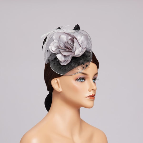 This exquisite hair-clip fascinator is a stunning formal fashion accessory. It features a light gray satin or silk-like fabric flower with layered 3D petals on a black tulle/organza netting base, accented with a small black detail at the flower’s apex.