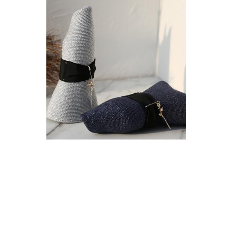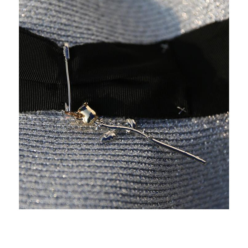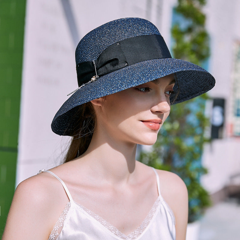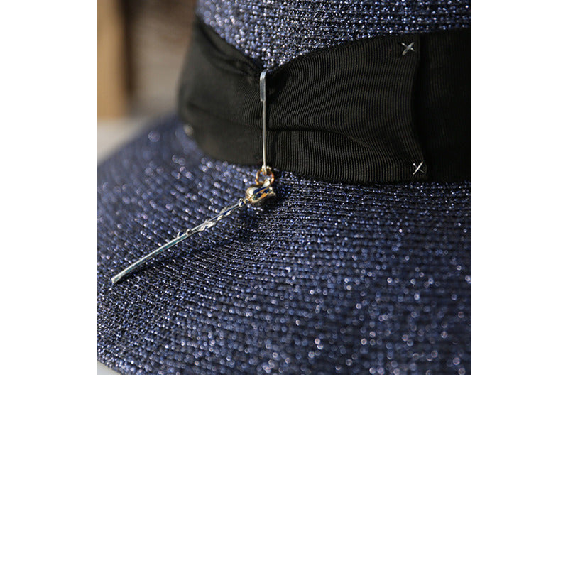 Discover this exquisite wide-brimmed sun hat, crafted from synthetic straw with metallic threads for a subtle sheen. The dark blue body, paired with a black satin ribbon band and a delicate decorative charm, combines classic style with modern elegance, making it a perfect accessory for summer.