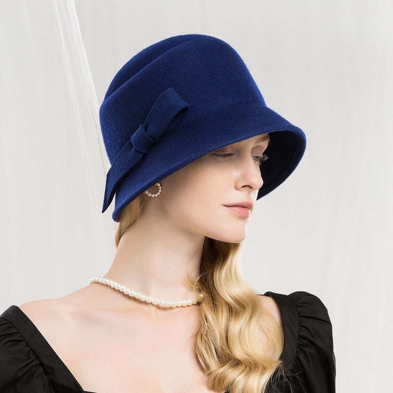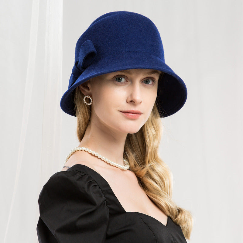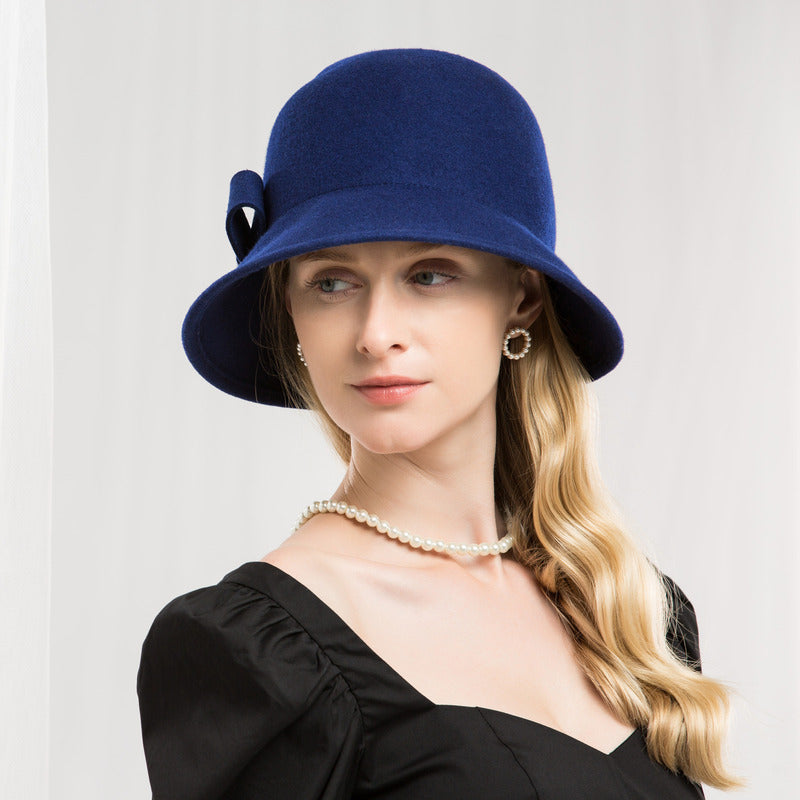 Step into a world of vintage charm with this exquisite cloche hat. Crafted from high – quality wool felt, it boasts a rich royal/navy blue color. The structured, mid – profile crown and wide pre – curved brim are adorned with a small, matching fabric bow, adding a touch of refined elegance.