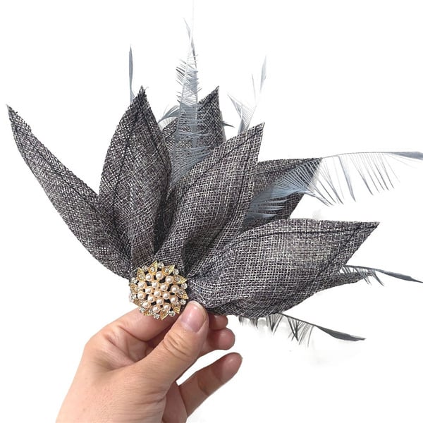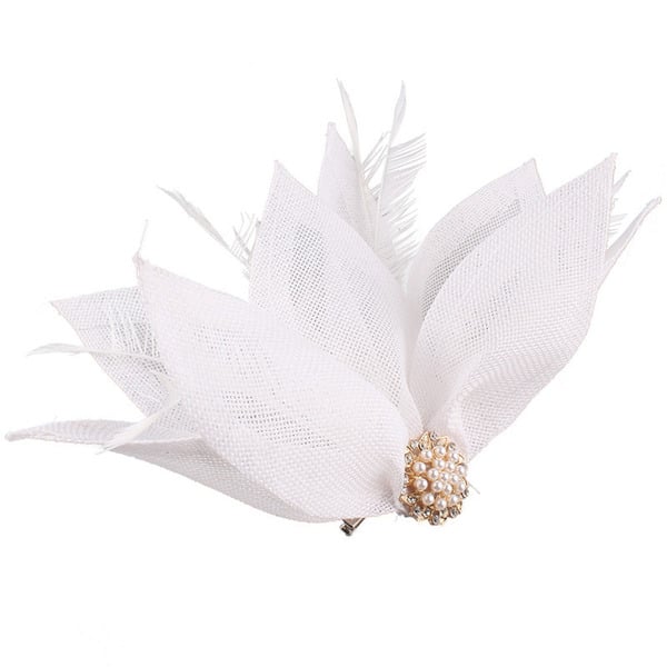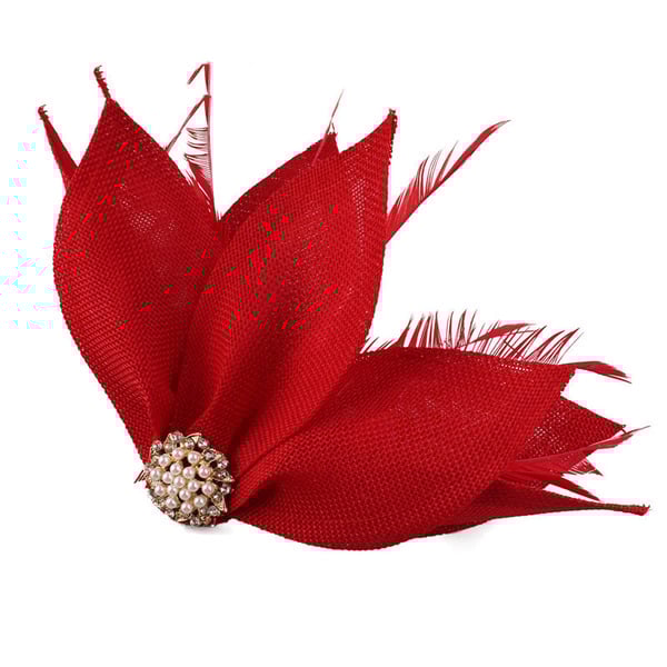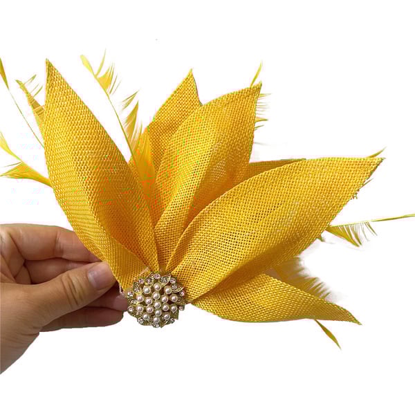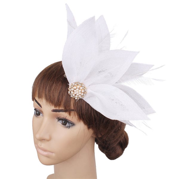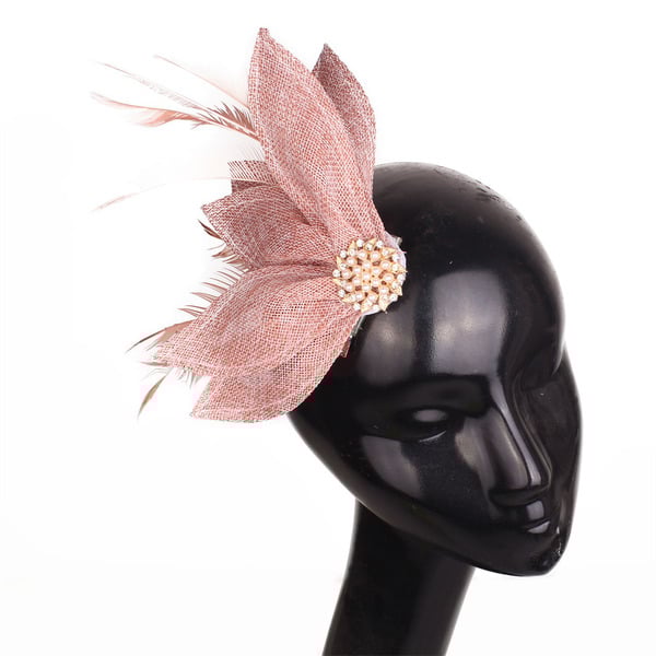 - Material: Woven synthetic fabric, synthetic feathers, metallic base, faux pearls, rhinestones