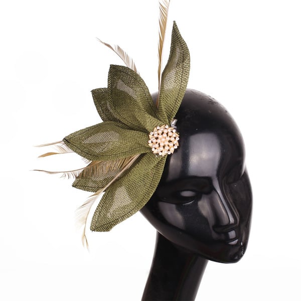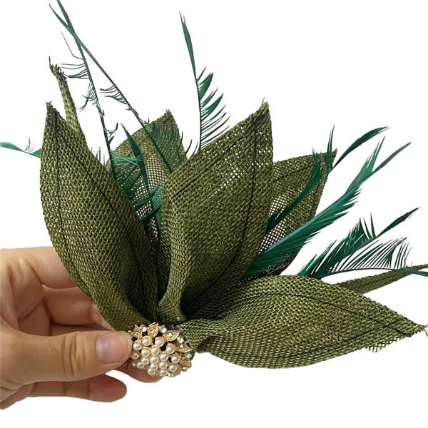 This exquisite fascinator is a stunning formal headwear accessory. It features a forest – green, textured woven synthetic fabric in leaf – shaped structures, adorned with synthetic green feather accents and a brooch – style centerpiece of gold – toned metal, faux pearls, and rhinestones.
