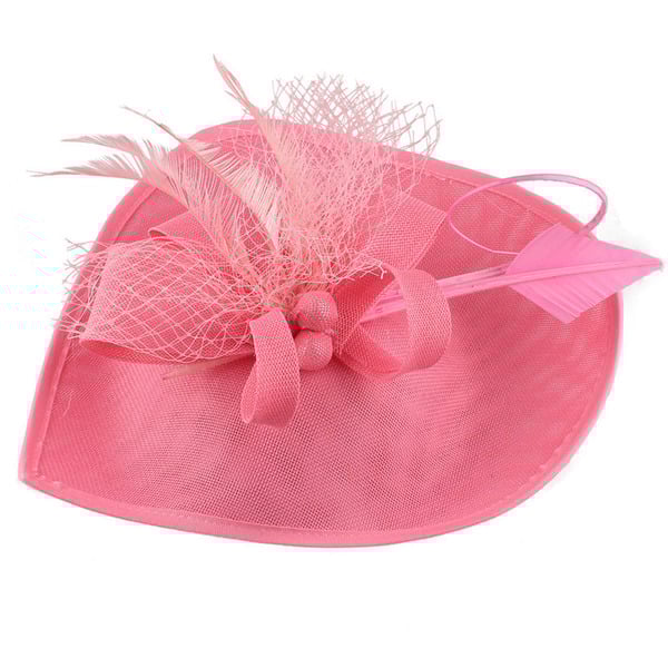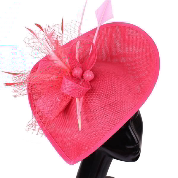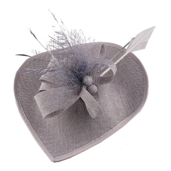This is a stunning fascinator, a formal occasion headpiece designed for high – fashion events. Crafted from a woven synthetic fabric, it features a soft, muted pink base with tonal accents of feathers, tulle, and a bow. The structured heart – shaped base with a short, curved brim adds a whimsical and feminine touch.