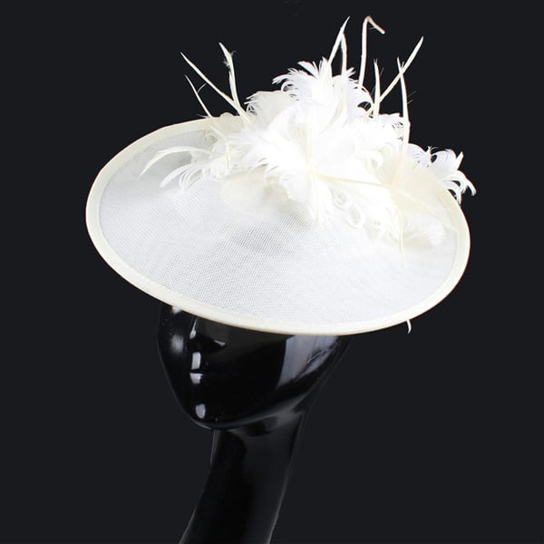 Introducing a stunning formal millinery fascinator crafted from stiffened sinamay with a smooth, woven texture. The solid white base is adorned with multi – tiered white synthetic feathers, creating an elegant and cascading floral – like effect. This structured headpiece features a wide, flat brim, perfect for framing the face at high – society events.