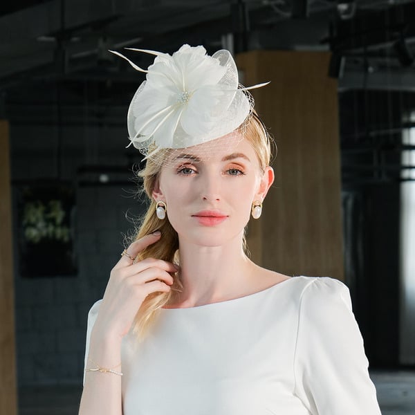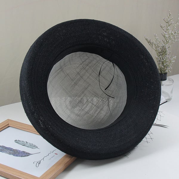 | Material | Lightweight Woven Straw (crown), Stiffened Woven Fabric (brim), Tulle/Mesh, Satin, Feathers (decorations) |