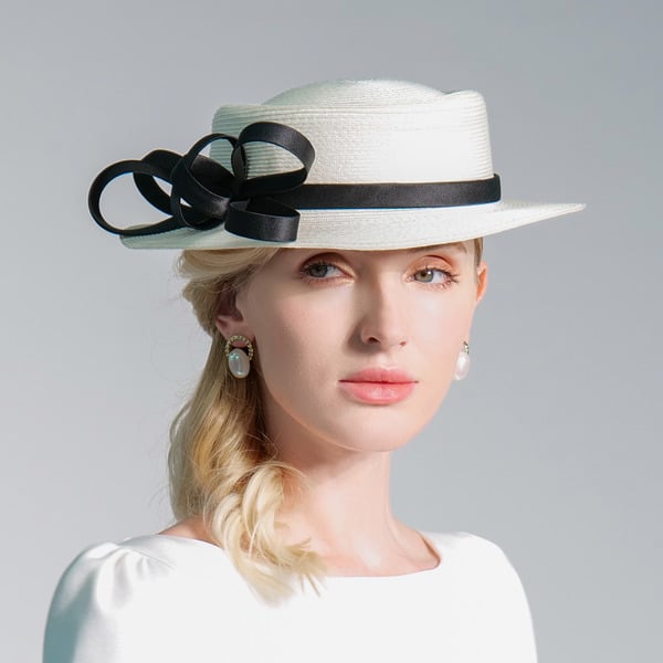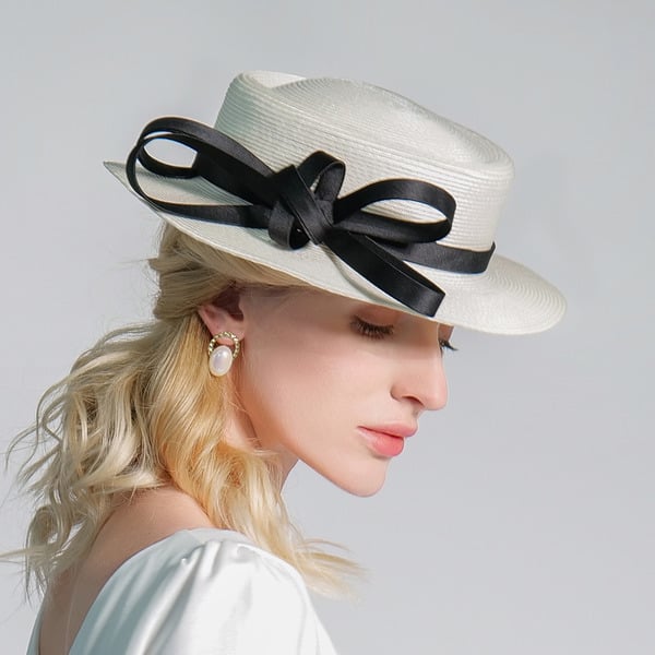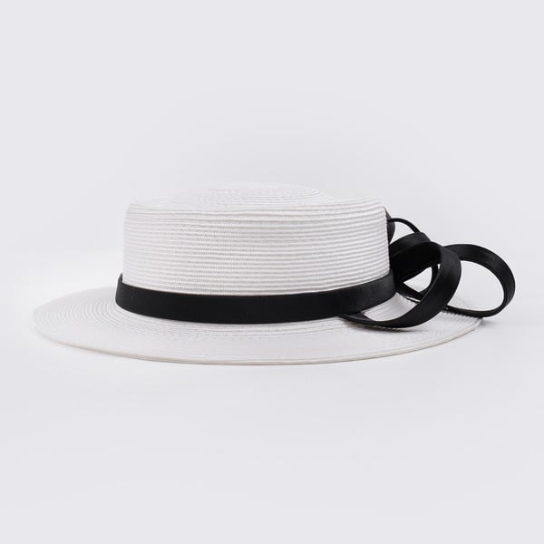 This is a stunning wide-brimmed sun hat crafted from high-quality woven straw. The hat features a solid white base with a neat black satin bow, creating a sophisticated two-tone look. The low-profile structured crown and wide flat brim offer both style and sun protection.