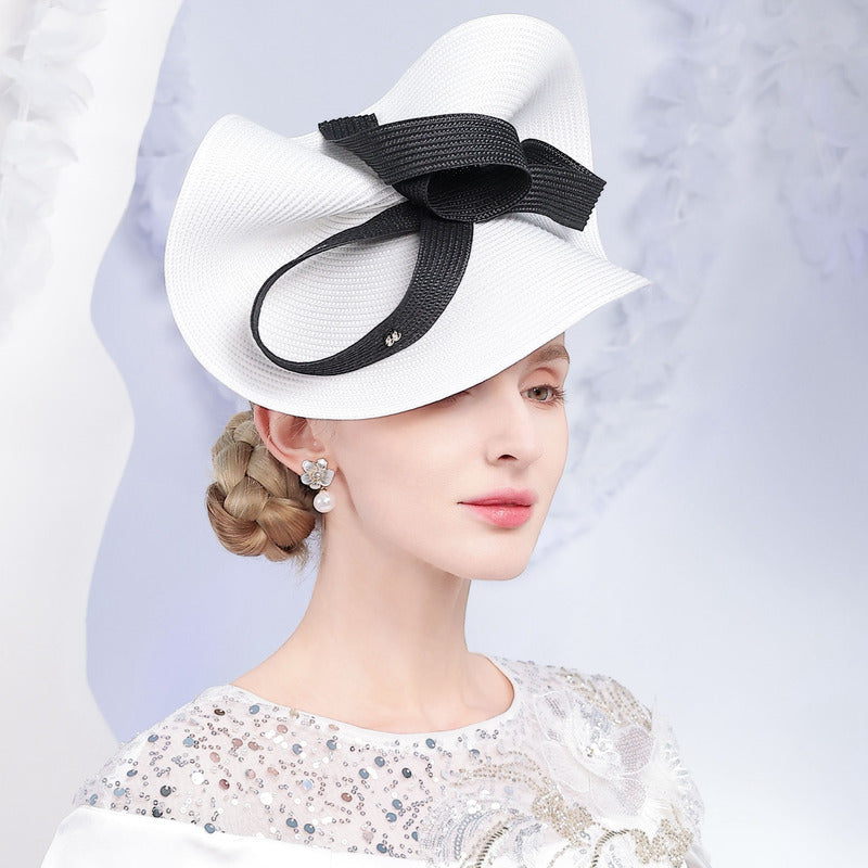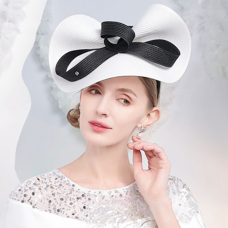 Introducing a stunning fascinator-style headpiece, perfect for elegant events. It features a white straw base with a structured, high – profile crown and a minimal, curved brim. The focal point is an oversized black satin bow, creating a classic and fashionable two – tone look.