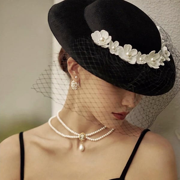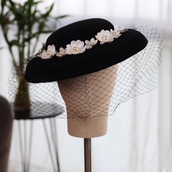 - Material: Wool felt (hat body), Nylon tulle mesh (veil), Fabric (flowers), Simulated pearls (plastic/resin)