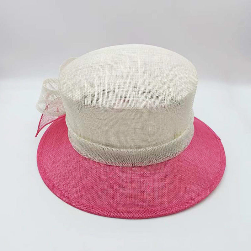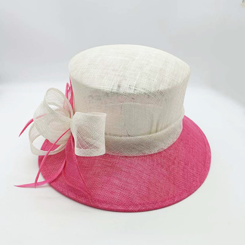 Enhance your formal attire with this exquisite fascinator. Crafted from a woven, lightweight fiber, it features a structured mid – profile crown and a wide, flat brim. The two – tone color scheme of white and bright pink is complemented by a large, voluminous white tulle bow with pink accents and pink feather – like trim, adding a touch of elegance and sophistication.