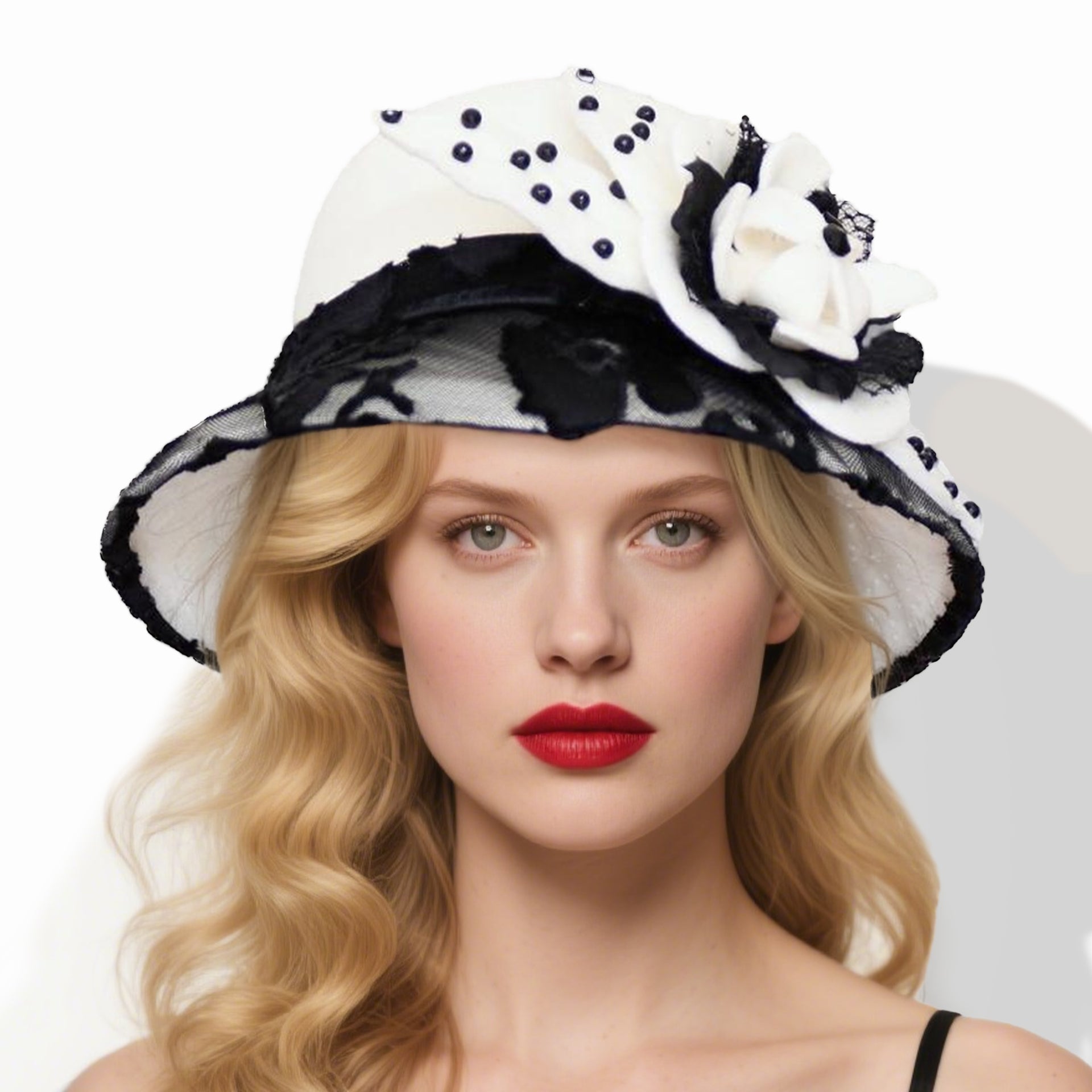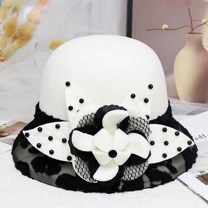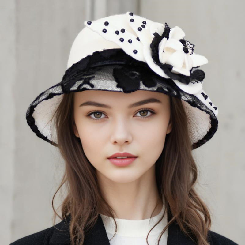 Step into elegance with this vintage-inspired fascinator-style hat. Featuring a structured white wool felt crown, it’s adorned with a black-and-white mesh brim, delicate black lace, and a large white satin flower with black accents. The black beads on the polka-dot panel add a touch of sophistication.