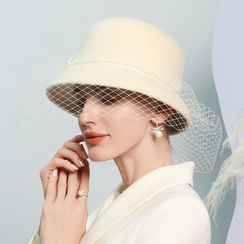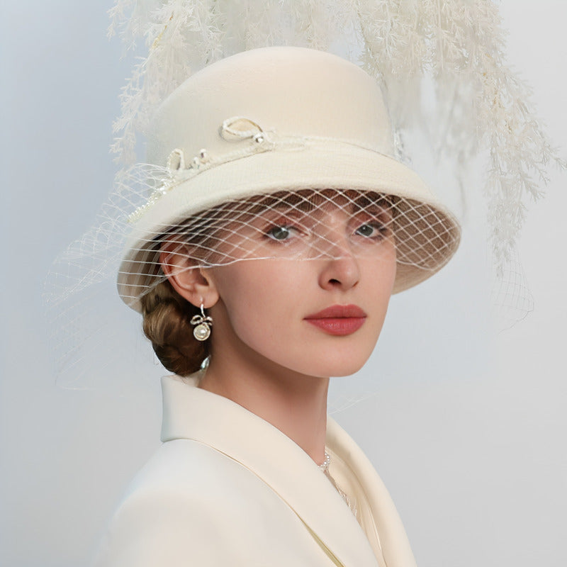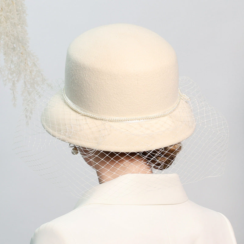 Step into elegance with this classic vintage formal dress hat. Crafted from high – quality wool felt, it features a solid white (ivory/cream) body, adorned with a pearl – embellished band and a delicate white veil. The structured crown and wide, slightly curved brim exude sophistication, making it perfect for special occasions.
