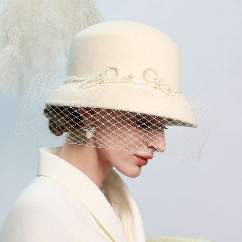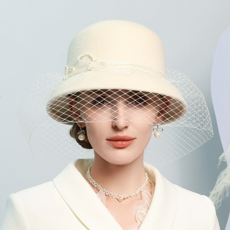 - Material: Wool Felt (Main Body), Nylon or Silk (Veil), Fabric and Faux Pearls or Gemstones (Decorative Band)