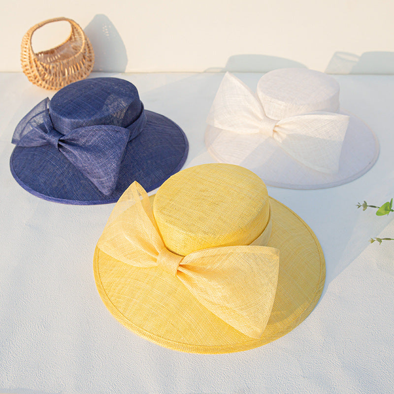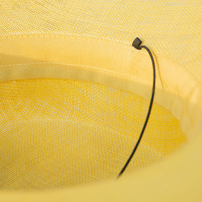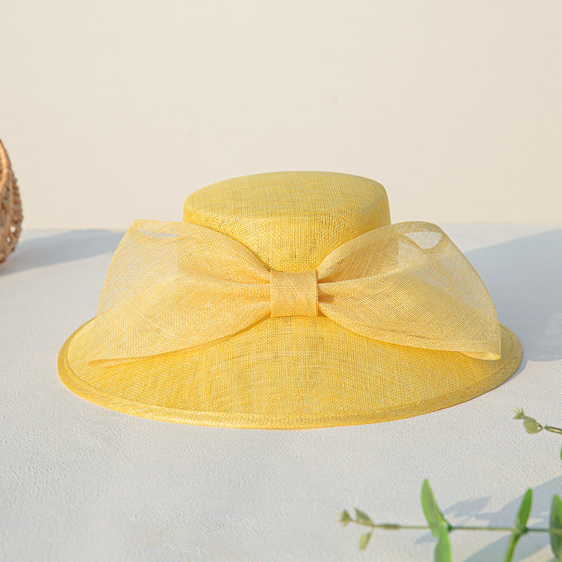 This formal sun hat is a stunning accessory crafted from a lightweight, woven straw-like synthetic material. Its bright yellow color makes a bold statement, and the central, neatly tied bow adds an elegant touch. The wide brim and structured mid-profile crown offer both style and sun protection.