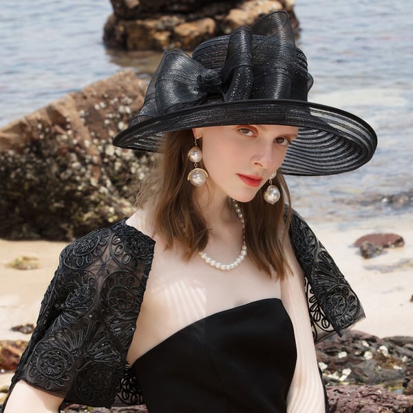 Step into elegance with this wide-brimmed formal hat. Crafted from a polyester – blend fabric with metallic threads, it features a solid black color with a subtle silver or iridescent sheen. The large, asymmetrical organza bow adds a touch of sophistication, making it perfect for special occasions.