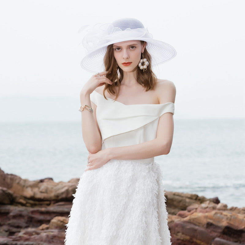 This wide-brimmed sun hat is a stunning piece crafted for formal events. The main brim is made of a stiff, woven synthetic fabric with a smooth, ridged texture, while the decorative element is organza. It features a solid white color scheme, with subtle vertical stripes on the brim and a soft, ruffled organza accent on the crown, along with a small feather-like detail.
