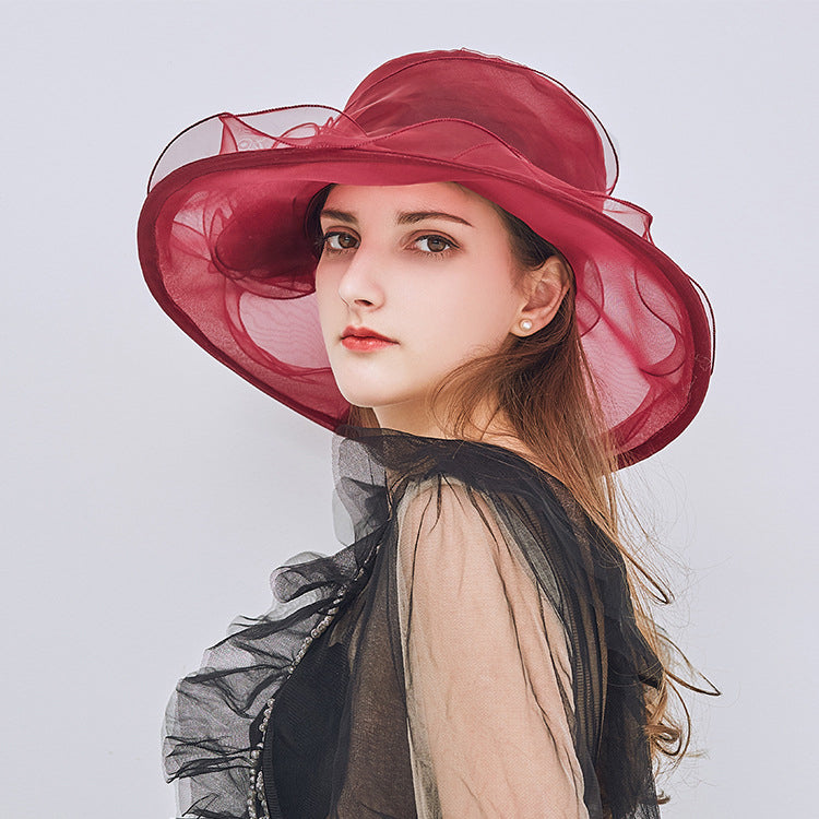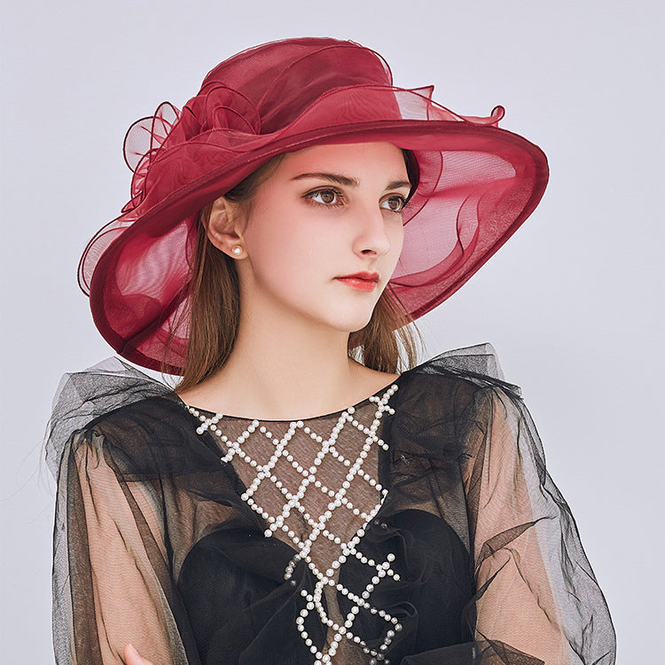 Introducing a stunning wide-brimmed sun hat crafted from polyester organza. This elegant women’s hat features a solid burgundy color, accented by a decorative ruffled fabric flower on the structured crown. Its multi-layered, slightly curved wide brim offers both sun protection and a fashionable touch.